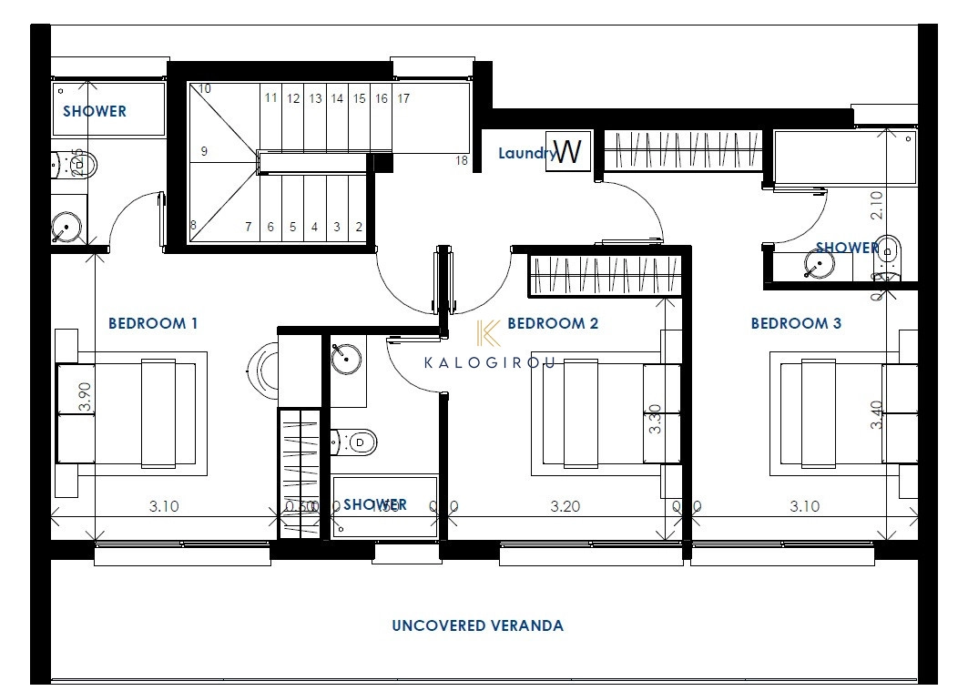 The house consists of an open plan kitchen with living room and dining and a guest toilet at the ground floor. At the upper floor, there are three bedrooms, all with en – suite shower with W/C.
