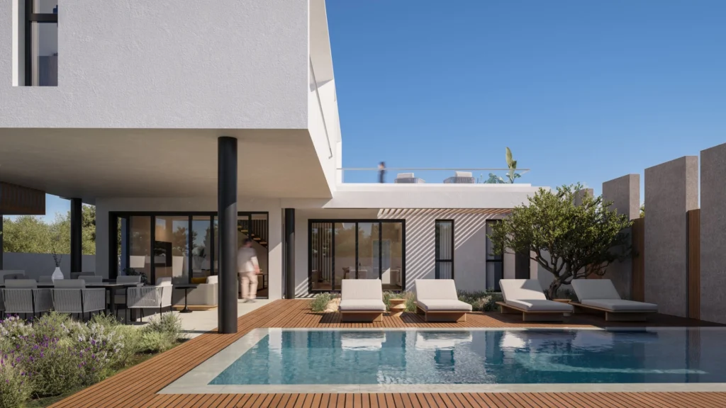 This detached five-bedroom villa offers a generous layout designed for contemporary living, featuring expansive open-plan interiors that connect seamlessly with the outdoor areas. The modern kitchen complements the spacious living and dining zones, creating a functional environment for both everyday comfort and hosting. Set on a sizable plot, the residence includes a private overflow swimming pool, landscaped gardens, covered parking, and a dedicated BBQ area, providing ample space for relaxation and entertaining. High-quality finishes, aluminium frames, and the option to customise selected features add to the property’s overall appeal. With walking-distance access to key facilities, this villa presents an excellent opportunity for refined living close to Larnaca’s main amenities and beaches. The main features of the project and the units: • Plot size: 520 sqm • Covered areas: 200 sqm • 5 bedrooms • 4 bathrooms • Open-plan living and dining areas • Modern kitchen • Private swimming pool • Landscaped gardens • BBQ area • Luxury finishes • Covered parking • Walking distance to main facilities • Optional roof garden The project has an EPC certificate with “A” energy efficiency rating.