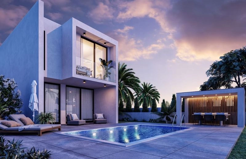 Three Bedroom Detached Villa for Sale In Chloraka, Paphos – Title Deeds (New Build Process) A stunning collection of 15 exclusive 3 bedroom villas. Each home offers breathtaking Mediterranean sea views, spacious outdoor living areas and is set in a serene gated community. Perfectly positioned by the beach and close to shops, restaurants, markets and schools. Each villa is designed with spacious interiors, using premium materials and modern aesthetics. Each home comes equipped with Smart home technology and energy conscious installations. - Master bedroom with fitted wardrobes and en-suite - 2 Further bedrooms with fitted wardrobes - Family bathroom - W/C - Open plan living – dining area - Contemporary architectural design - Modern kitchen - Unfurnished - Garage - Optional landscaped garden - Optional swimming pool - CCTV & alarm system - Underfloor heating - Barbecue area - Covered area 110 – 118 m2 - Covered veranda 19 – 23 m2 - Plot 230 – 395 m2 - 10 Minutes to Paphos Harbour with its wide selection of restaurants, bars and amenities - 5 Minutes to the nearest beach - 22 Minutes to the nearest golf course - 26 Minutes to Paphos International Airport - Suitable for Cyprus Permanent Residency – Fast Track - Subject to VAT - Energy Efficiency TBC Chloraka Chloraka is located 3 km north of Paphos Town and borders the tourist area known as the Tomb of the Kings. It is also home to Akritas Chloraka, a Cypriot Second Division football team. There are many hotels, restaurants and bars in this village which runs along the coast road from Paphos Town to Coral Bay. Chloraka’s location was put on the map in March 1998 when the cargo ship Demetrios II ran aground in heavy seas, the vessel is easily visible and has now become quite a focal point. ———— * Title Deeds (New Build Process) * Optional Pool * Sea Views * Subject To VAT * Suitable for Cyprus Permanent Residency – Fast Track * Off Plan – Delivery TBC * Energy Efficiency TBC Chloraka Chloraka County: Paphos Sale Type: For Sale Ref #: PRO023N3