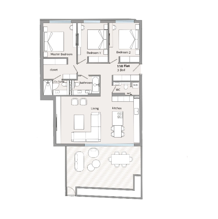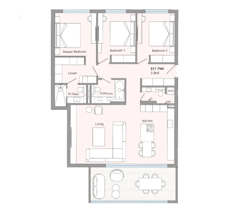 The kitchen combines elegant design with practical functionality, offering an inviting space for cooking, gathering, and entertaining. Three well-proportioned bedrooms allow for flexible arrangements: a master suite for enhanced privacy, a children’s room, guest accommodation, or even a dedicated home office.