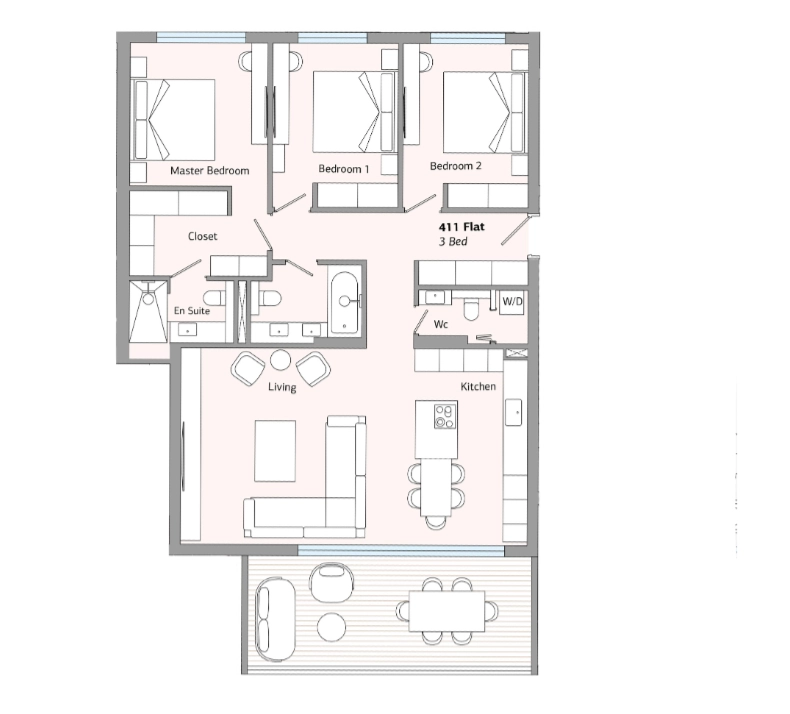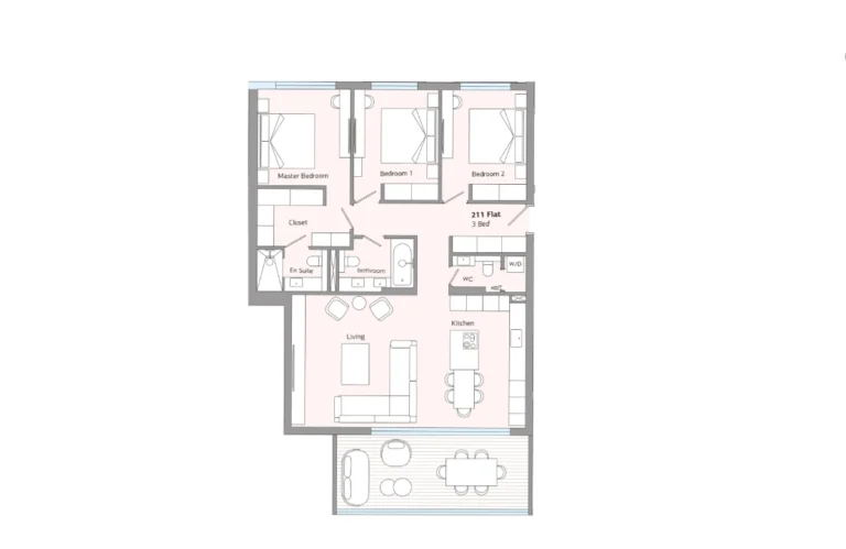 The kitchen combines elegant design with practical functionality, offering an inviting space for cooking, gathering, and entertaining. Three well-proportioned bedrooms allow for flexible arrangements: a master suite for enhanced privacy, a children’s room, guest accommodation, or even a dedicated home office.