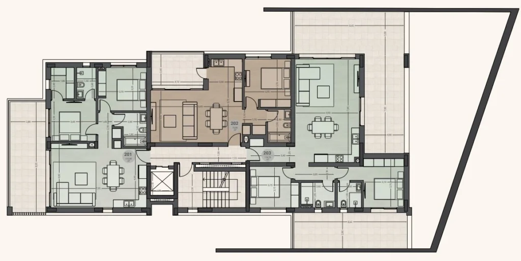 The modern architecture is exclusively crafted with elegant lines, floor-to-ceiling windows, and spacious terraces, creating harmonic and unified spaces with luxury natural materials and an abundance of natural light, thereby enhancing a comfortable and elegant atmosphere.