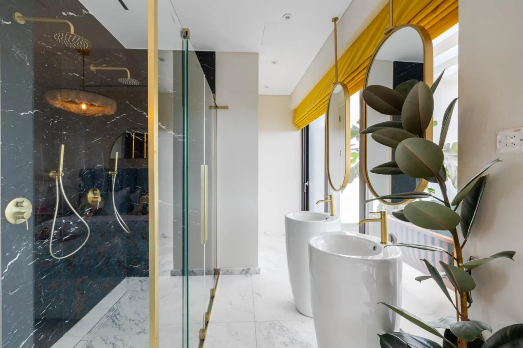 Set on a generous private plot, the villa offers sea views from its top-floor veranda, lush Mediterranean landscaping, and a sleek saltwater lap pool — perfect for serene swims or stylish gatherings. Indoors, the aesthetic blends Parisian chic with Old Hollywood allure: a deep blue designer kitchen with premium appliances, marble bathrooms with granite accents, and a master suite sanctuary with a freestanding bathtub, double rainfall shower, and boutique-style dressing room.