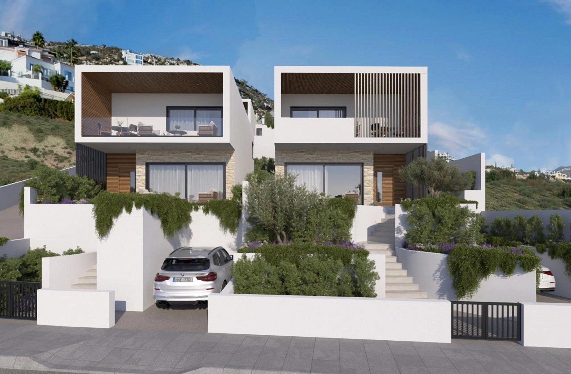 Perched on the quiet hillsides of Peyia, this boutique collection of six contemporary villas offers a refined take on Mediterranean living, framed by sweeping views of Coral Bay and the coastline. Each residence is thoughtfully placed along the natural slope, creating a sense of privacy while maintaining a harmonious architectural rhythm. Clean geometric lines, deep terraces, and warm textures define the design, giving every villa a distinct yet unified identity.