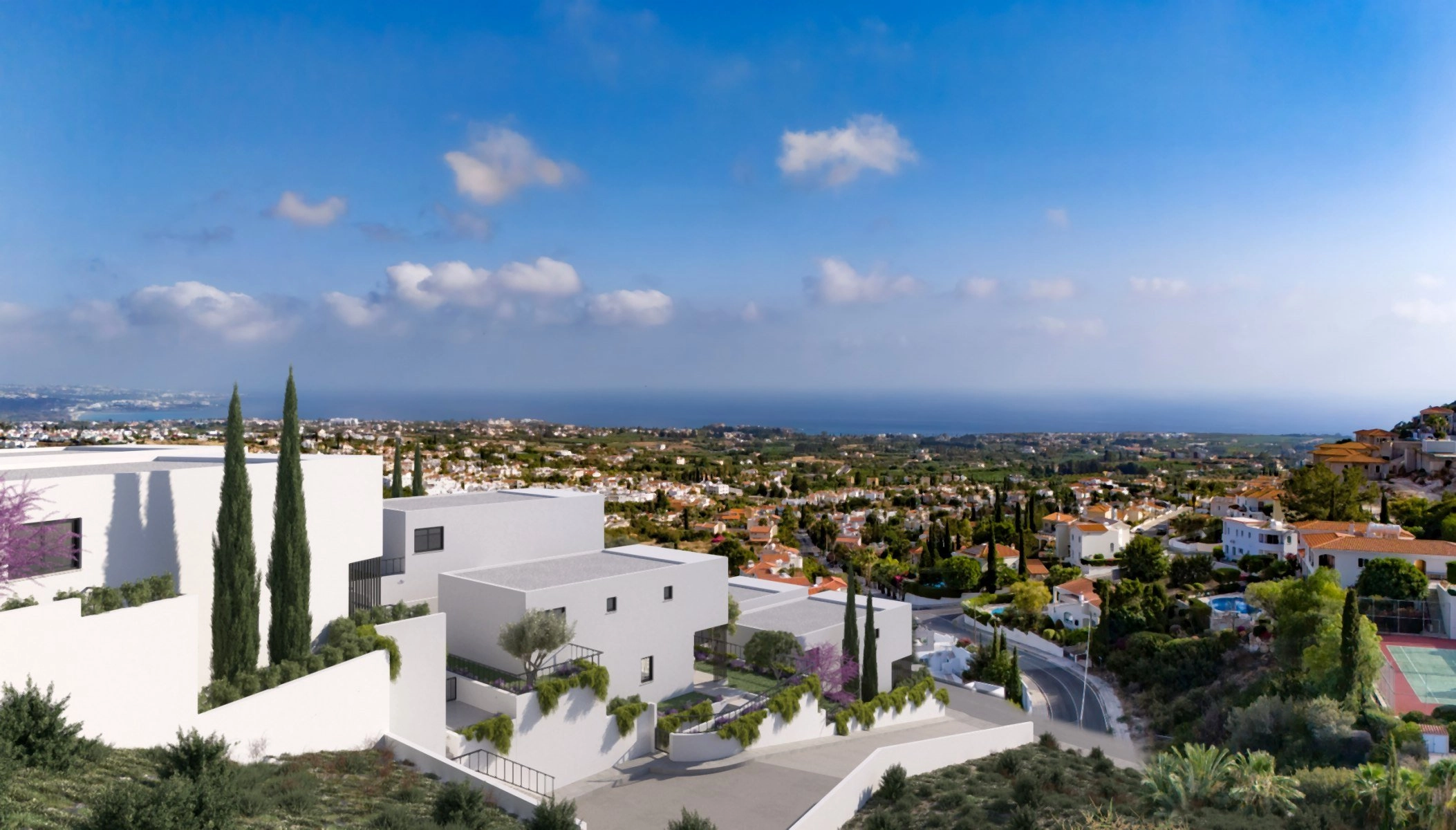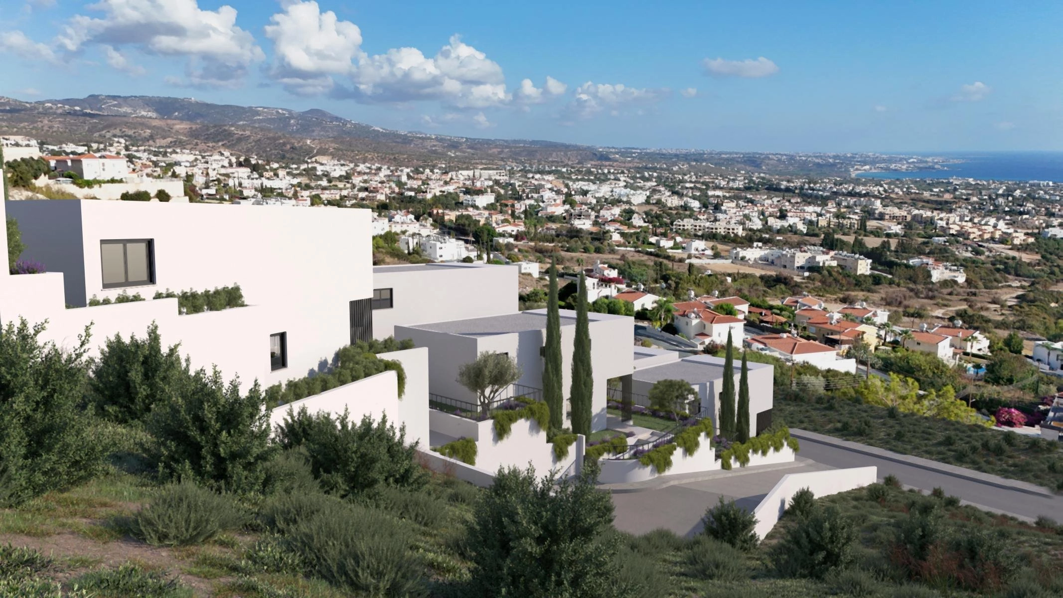 Perched on the quiet hillsides of Peyia, this boutique collection of six contemporary villas offers a refined take on Mediterranean living, framed by sweeping views of Coral Bay and the coastline. Each residence is thoughtfully placed along the natural slope, creating a sense of privacy while maintaining a harmonious architectural rhythm. Clean geometric lines, deep terraces, and warm textures define the design, giving every villa a distinct yet unified identity.