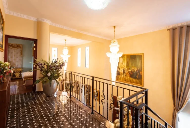 Inside, the villa features spacious, thoughtfully designed interiors. The ground floor includes a welcoming reception hall, open-plan living and dining areas, a fully equipped kitchen, and a master bedroom with en-suite bathroom and access to verandas. The upper level offers three bedrooms, a shared bathroom, a TV area, and a large veranda. The lower ground level provides a recreation area, including a billiard space, additional rooms, and garage facilities. High-quality finishes, underfloor heating, air-conditioning, and modern security systems add comfort and peace of mind.