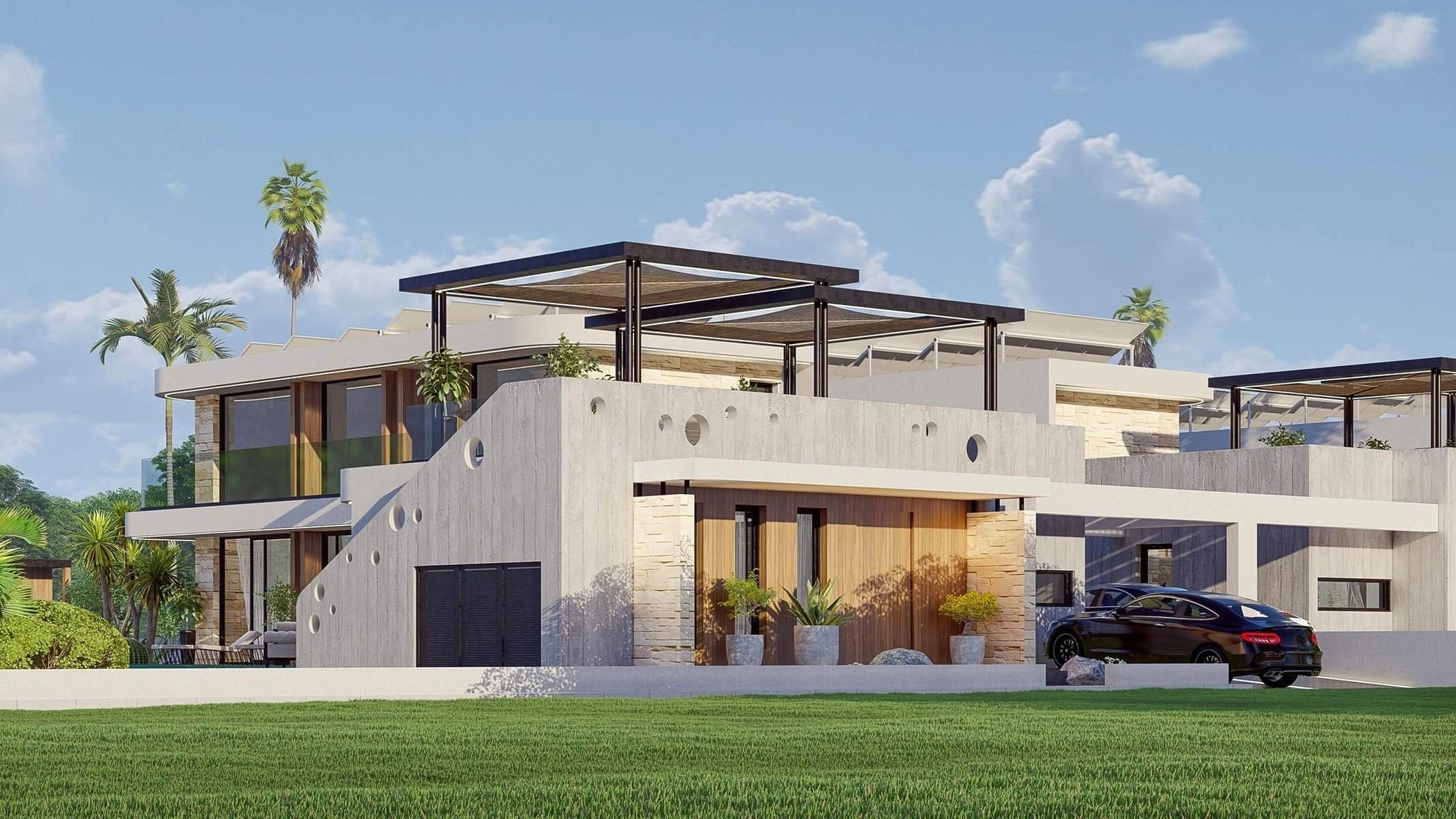 Nestled on spacious plots, each villa features a unique architectural character, crafted with high-quality materials and attention to detail. The open-plan layout includes a stylish kitchen with a central island, a bright and airy living room designed for both comfort and style, and three modular bedrooms.