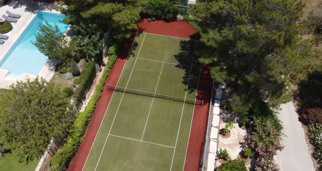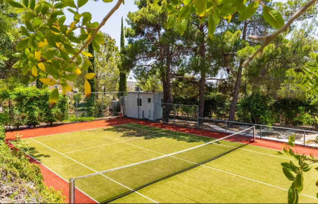Additional outdoor features include a private tennis court, oudoor gym and multiple seating and lounging areas thoughtfully arranged for relaxation or entertaining guests. A fully equipped outdoor kitchen adds another layer of convenience, making al fresco dining and hosting both practical and enjoyable.