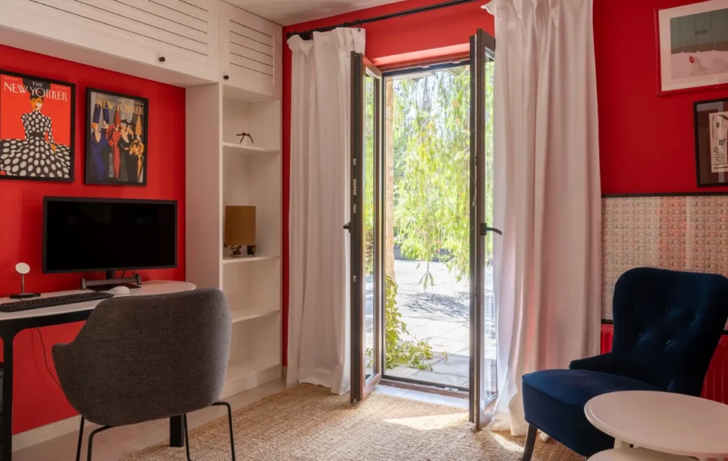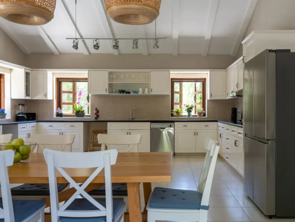 Inside, the main house boasts a thoughtfully designed layout with three spacious bedrooms, two of which feature en-suite bathrooms. The heart of the home is a vast, light-filled kitchen with windows on all sides, creating a bright and inviting space. The kitchen offers ample countertop space and easily accommodates a 10-seater dining table – perfect for family gatherings or entertaining in comfort and style.