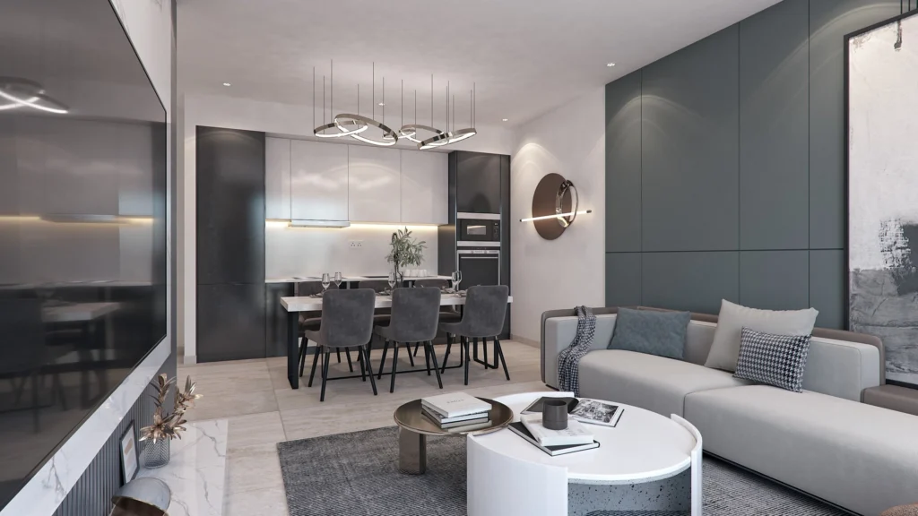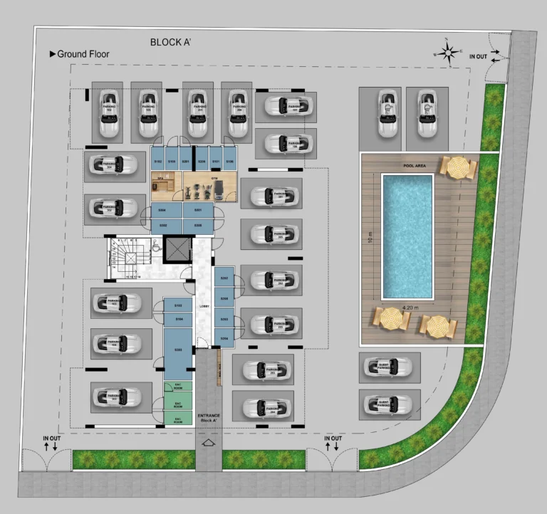 This residential development comprises two modern blocks, A and B, featuring one, two, and three-bedroom apartments. Each block is equipped with a shared swimming pool, ensuring a high standard of living for all residents. The apartments are designed to offer comfort and convenience in an exceptional location.