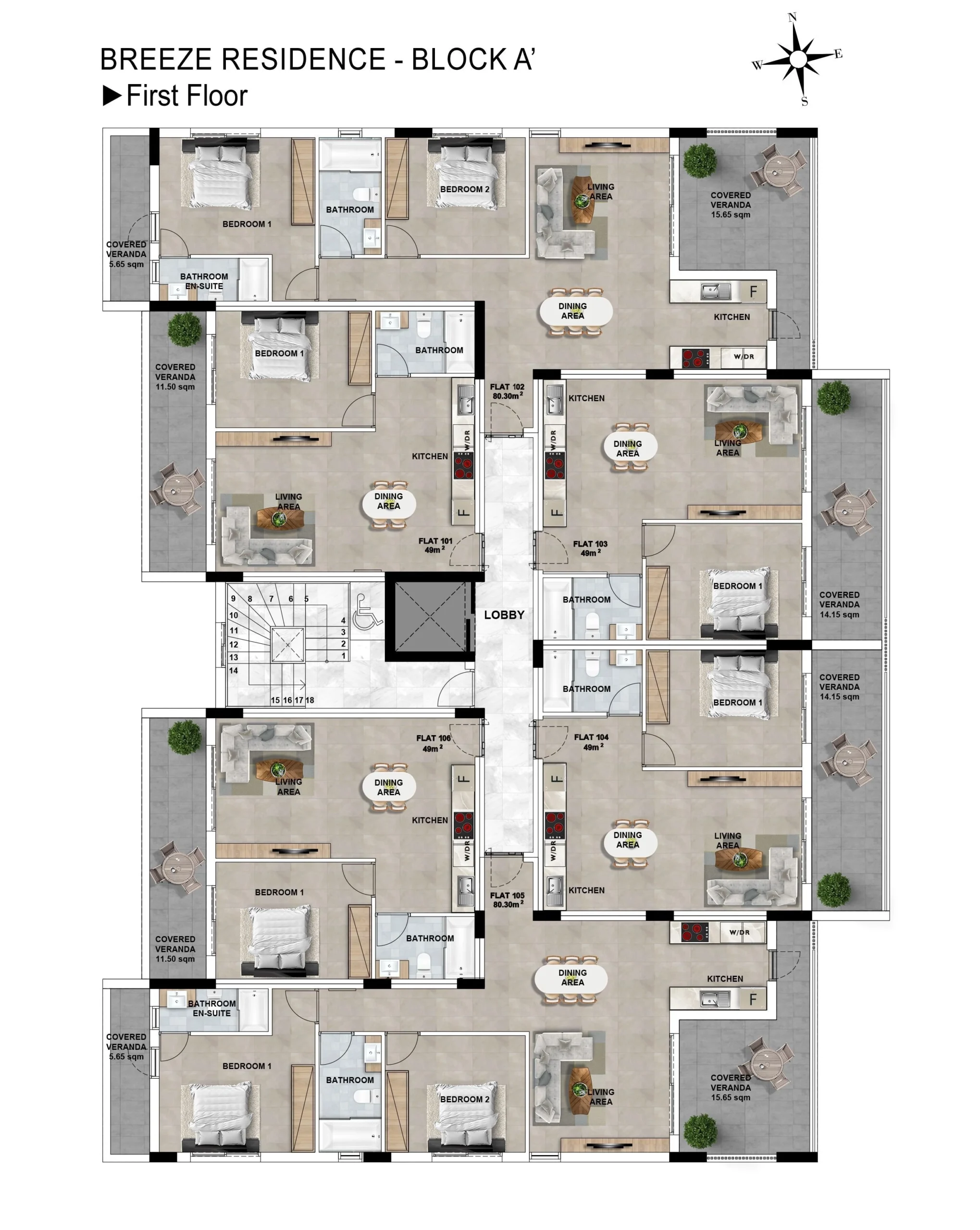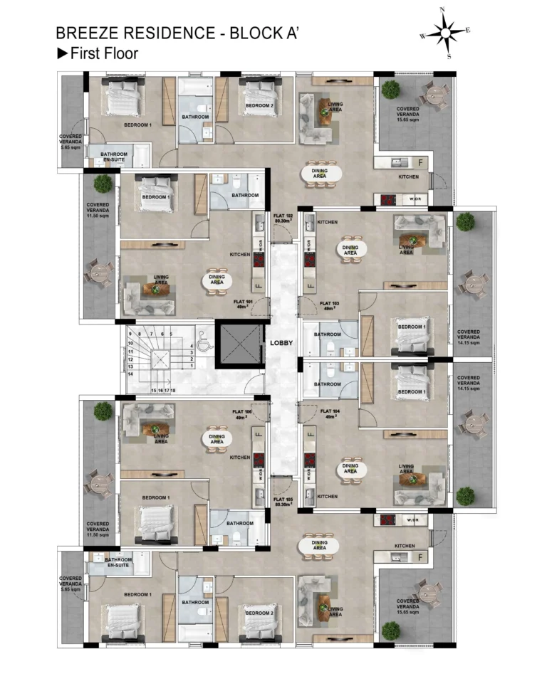 This residential development comprises two modern blocks, A and B, featuring one, two, and three-bedroom apartments. Each block is equipped with a shared swimming pool, ensuring a high standard of living for all residents. The apartments are designed to offer comfort and convenience in an exceptional location.