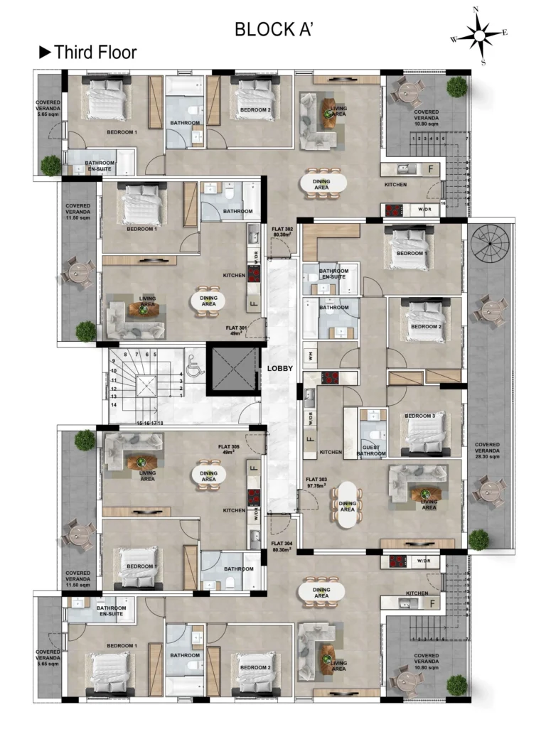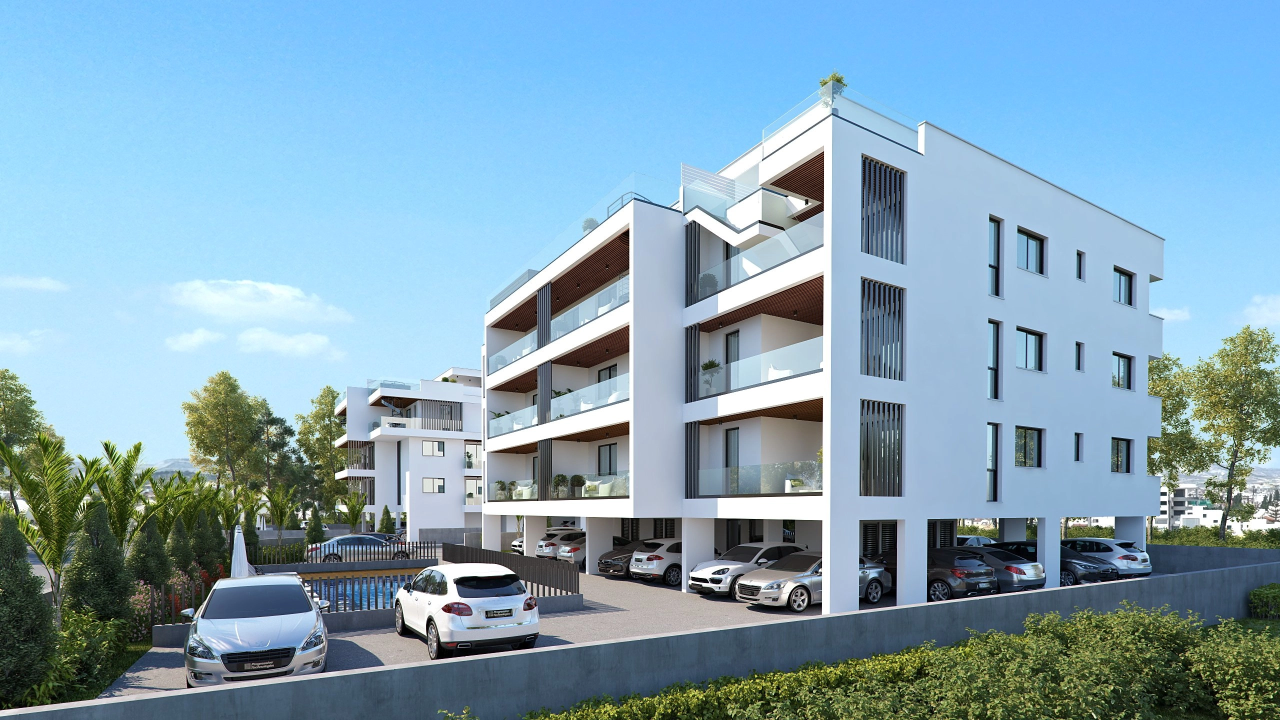 This residential development comprises two modern blocks, A and B, featuring one, two, and three-bedroom apartments. Each block is equipped with a shared swimming pool, ensuring a high standard of living for all residents. The apartments are designed to offer comfort and convenience in an exceptional location.