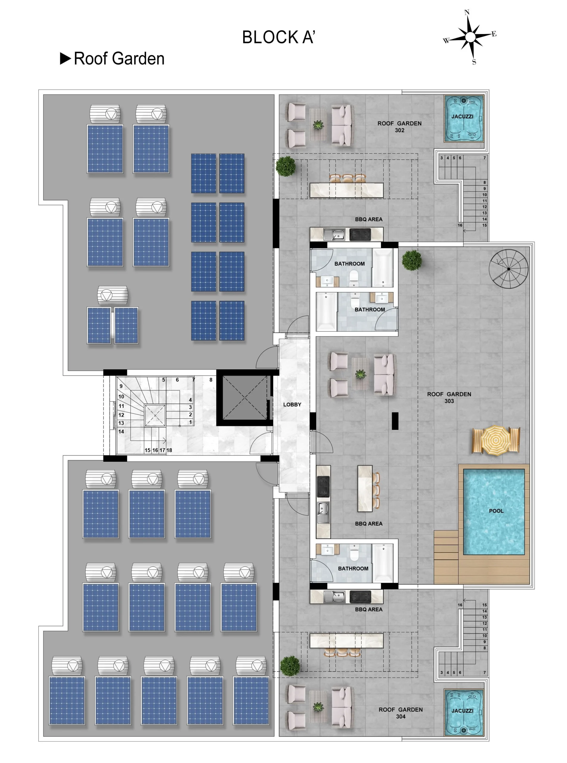 Three-bedroom penthouse 303, with a living area of 103 m² and a 48 m² roof garden, is located on the third floor of a three-storey building in Block A.