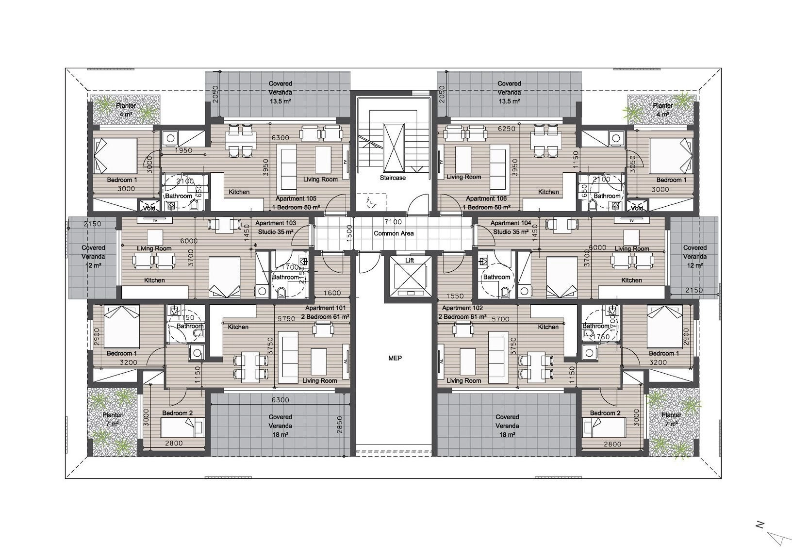 • Internal Area: 61 m²