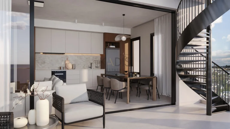 Apartment for sale in New Mall area, Larnaca. It consists of an open plan kitchen, living, dining area, a main bathroom (walk in shower), two bedrooms- one of them en suite, and covered veranda. Moreover, the residents have access to an allocated covered parking space and storage room the ground floor.