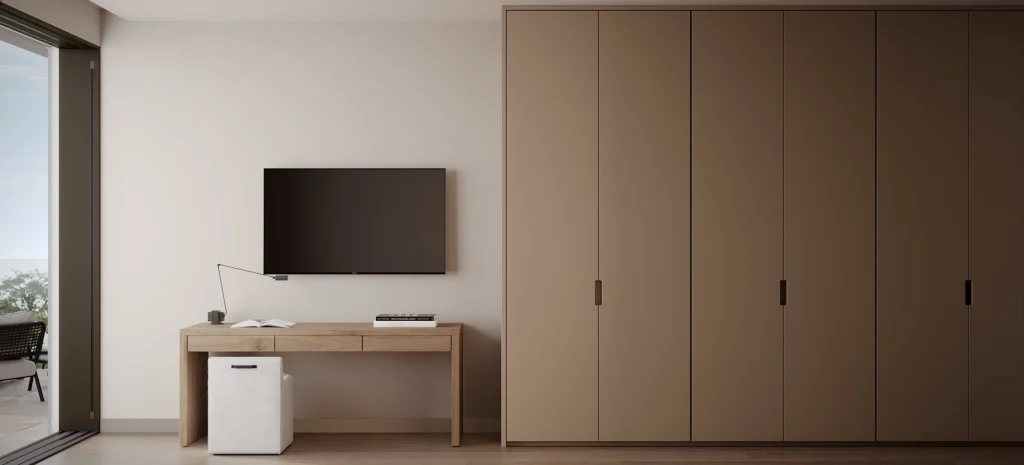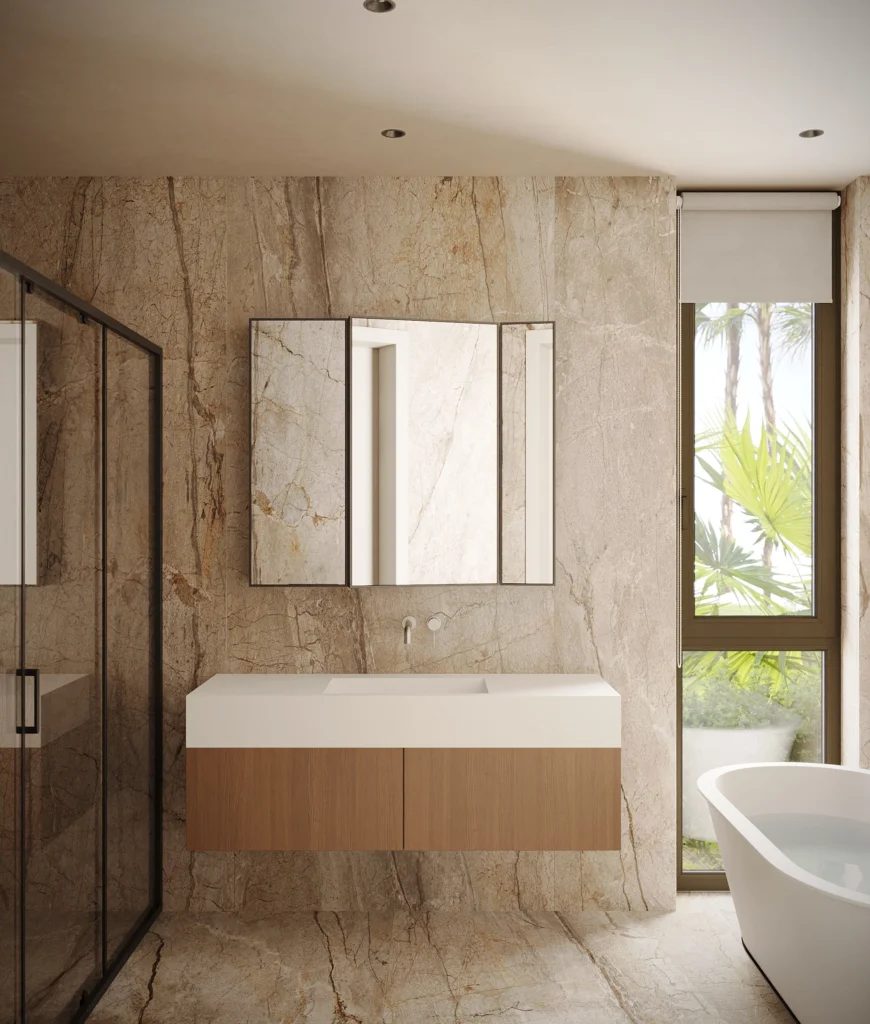 The interior design follows the same philosophy as the exterior, embracing earthy tones and natural materials. Through generous openings, the spaces are filled with abundant natural light while framing views towards both