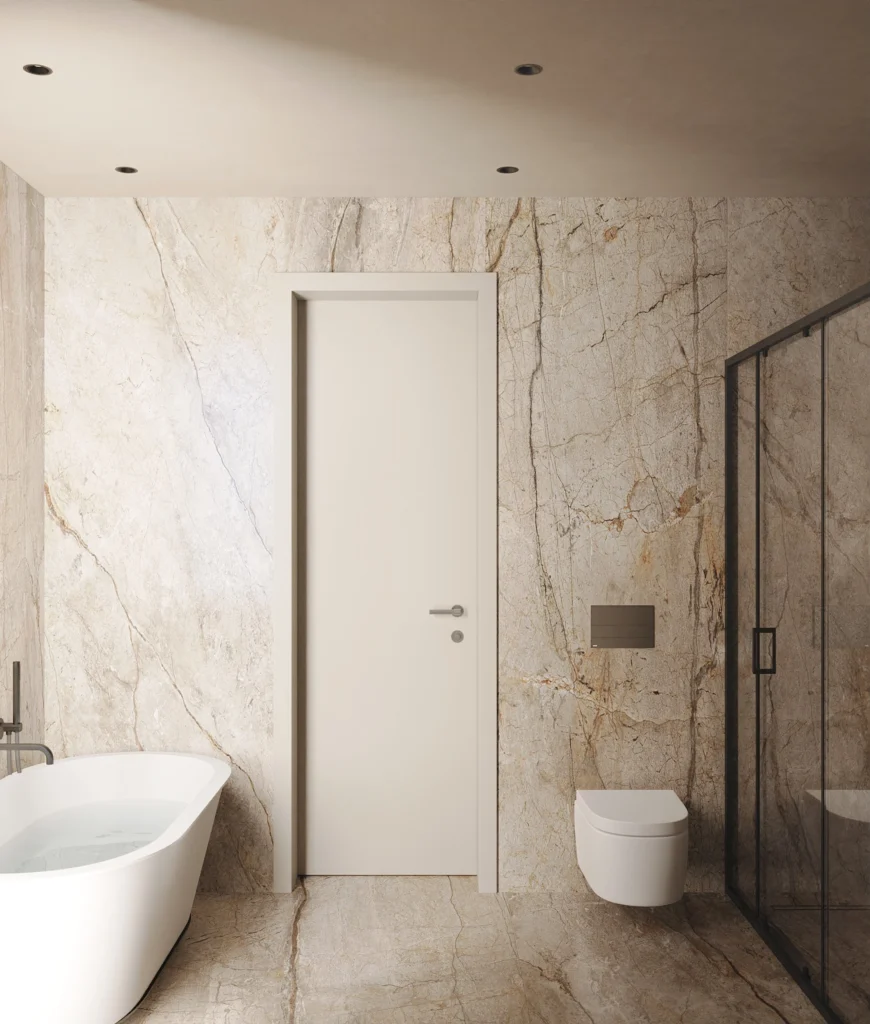The interior design follows the same philosophy as the exterior, embracing earthy tones and natural materials. Through generous openings, the spaces are filled with abundant natural light while framing views towards both