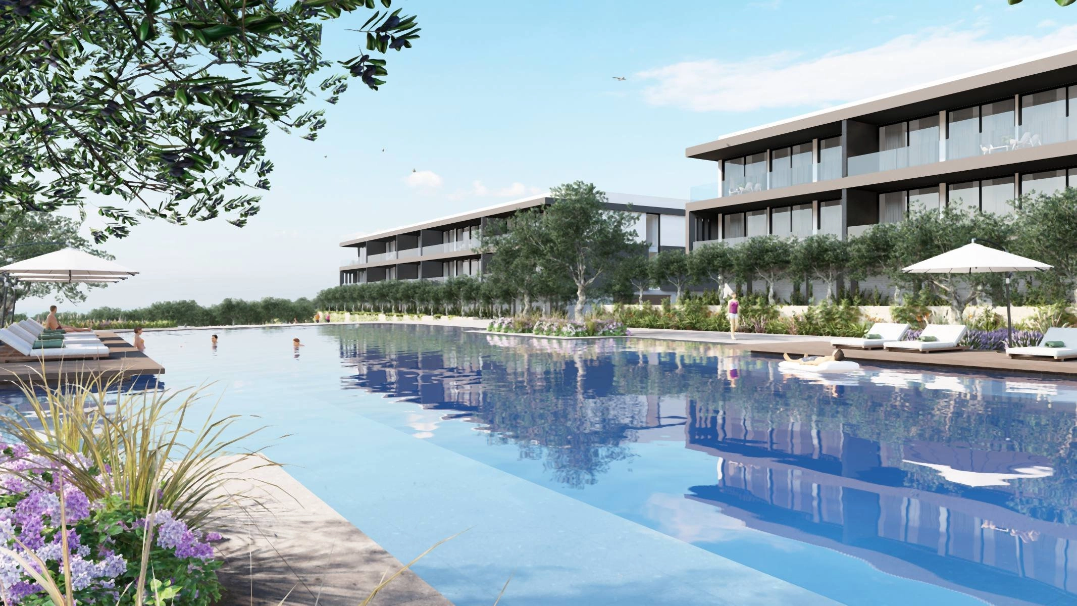 Mornings begin with silver leaves shifting in the breeze: more than 400 olive trees frame a refined residential community designed to feel calm, considered, and quietly upscale. Nine elegant apartment buildings host 150 contemporary homes, set among landscaped gardens where light, greenery, and open sky do the talking.