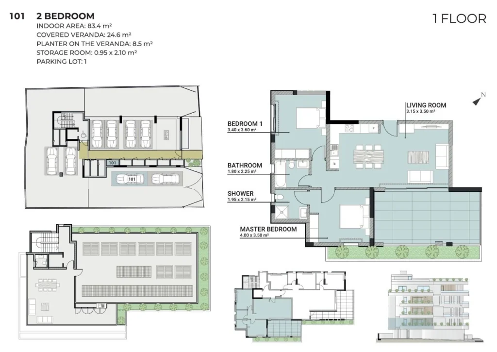 Two-bedroom apartment 101, with an internal area of 83.4 m², is located on the first floor of a four-storey building.