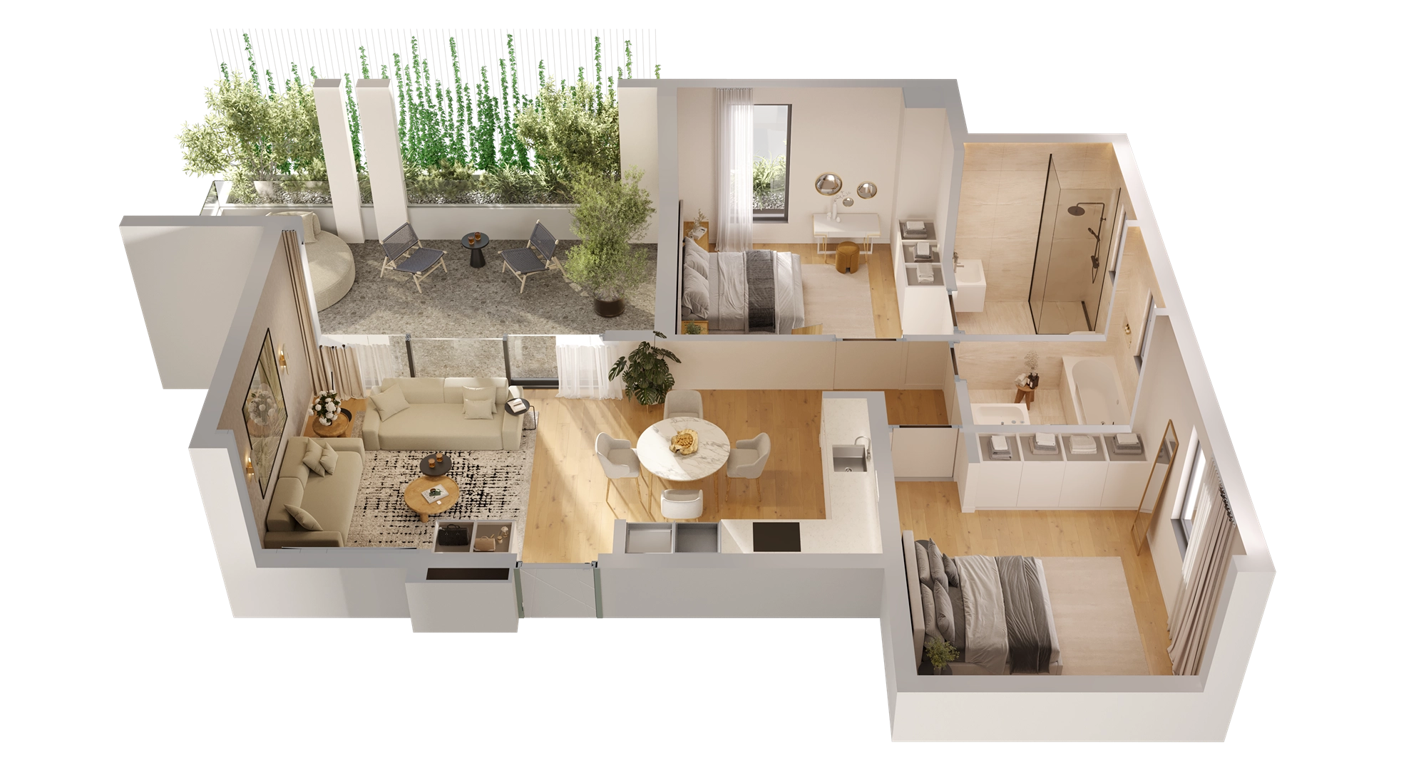 Each apartment in this complex is a unique combination of elegant, spacious and comfortable layouts, where the main thing is the space for the whole family in a large living room with a kitchen area, as well as a covered terrace with greenery.