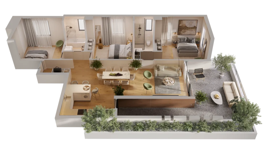 Each apartment in this complex is a unique combination of elegant, spacious and comfortable layouts, where the main thing is the space for the whole family in a large living room with a kitchen area, as well as a covered terrace with greenery.
