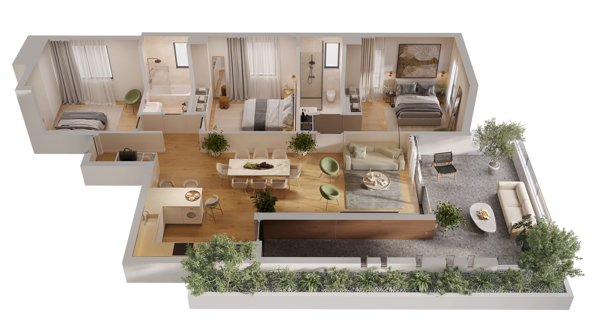 Each apartment in this complex is a unique combination of elegant, spacious and comfortable layouts, where the main thing is the space for the whole family in a large living room with a kitchen area, as well as a covered terrace with greenery.