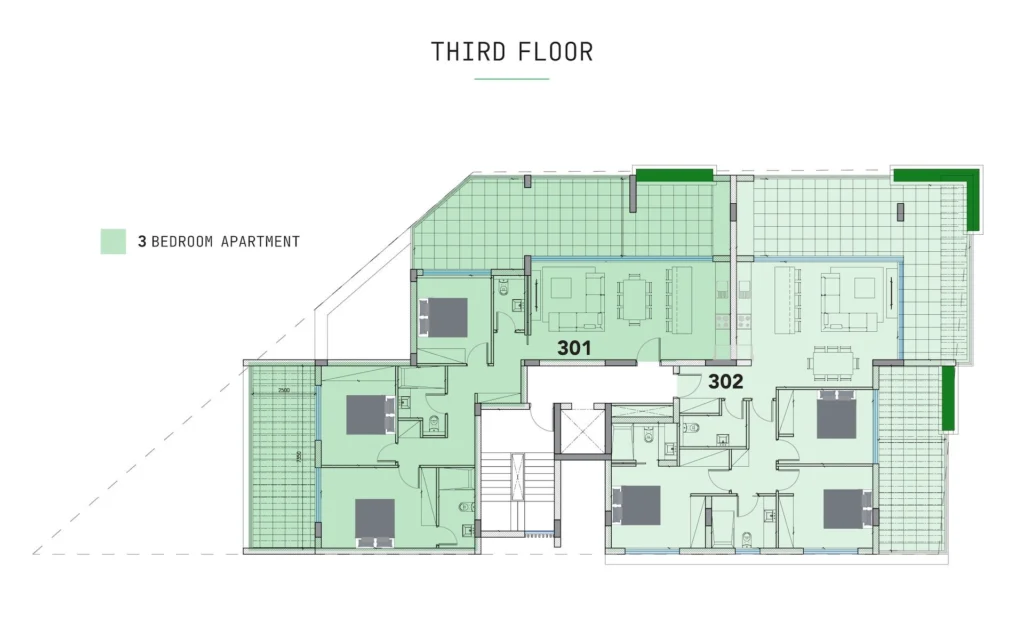 This three-bedroom apartment offers spacious, luxurious living with a focus on comfort and style. The apartment features a well-thought-out layout, with three generously sized bedrooms, an open-plan living and dining area, and large balconies offering green-facing views and abundant natural light.