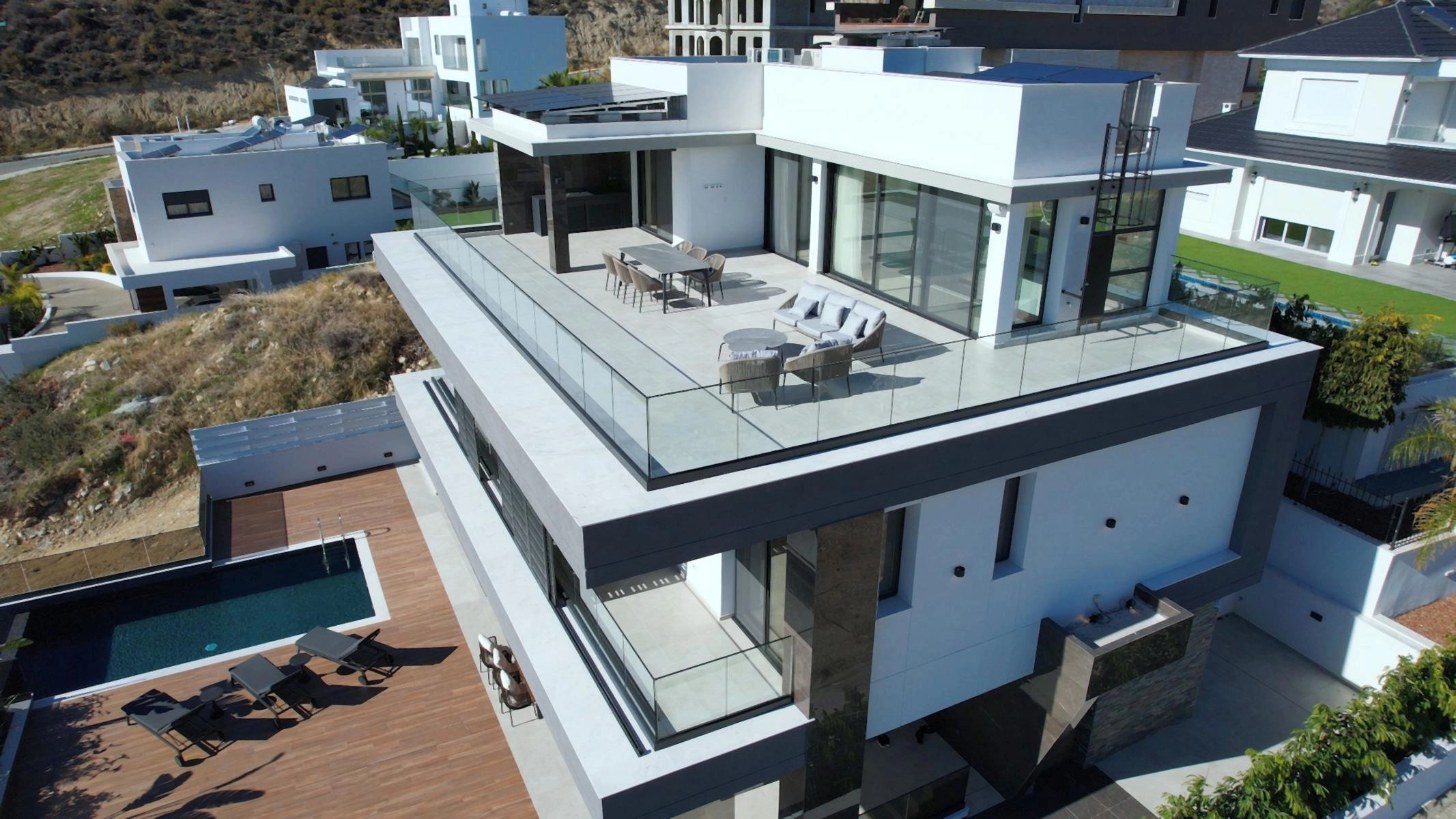 The house is designed for comfort and leisure, with outdoor and heated indoor saltwater swimming pools, a Jacuzzi for up to ten people, a custom-built sauna, a private gym, and a cinema room equipped with a 4K projector and advanced sound system. A dedicated laundry room, server room, and a large children’s playroom or guest room further enhance functionality. The rooftop garden with BBQ area offers panoramic sea views and a perfect space for relaxation and entertaining.