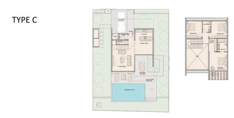 A three-bedroom, two-storey villa №13 with a private swimming pool, offering an internal area of 165 m², is situated on a 381 m² plot.