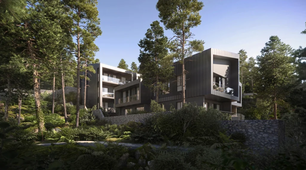 :blackpine redefines the concept of mountain living by introducing a bold, contemporary aesthetic to the pine forests of Prodromos. The project comprises a limited collection of modern apartments and houses, designed with dark cladded façades and expansive glass surfaces that allow the structures to merge seamlessly with the landscape. This is a private enclave for those seeking a quiet connection to nature without sacrificing modern architectural standards.