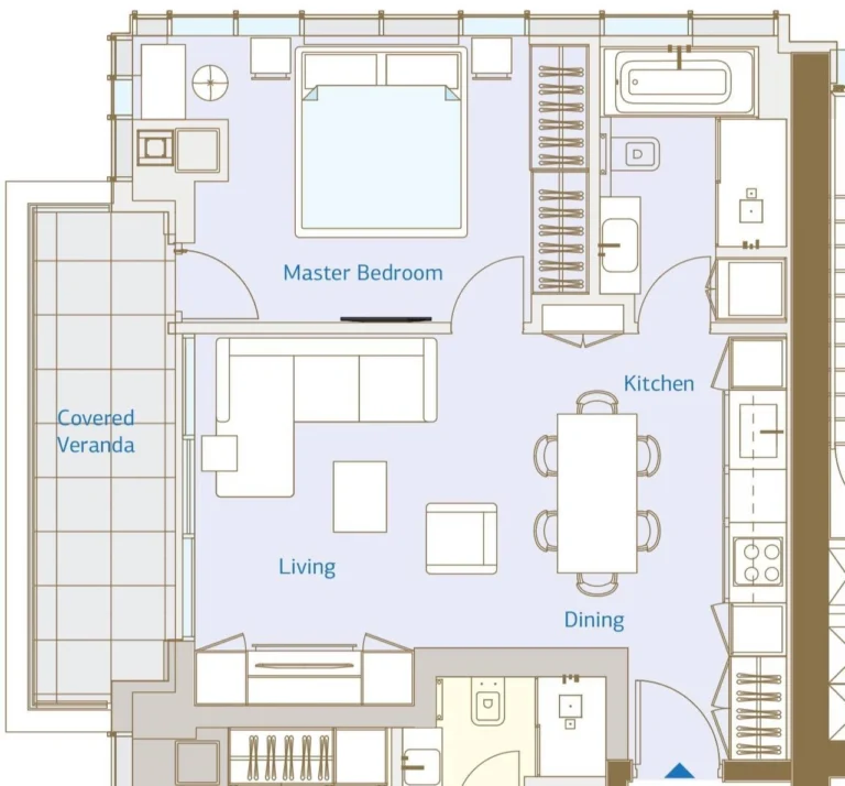 The apartment boasts a total covered area of 75 sqm, including an 18 sqm covered veranda, providing an ideal space for relaxation and indoor–outdoor living with views from the 4th floor. The high ceilings and well-planned layout enhance the sense of space and natural light throughout.