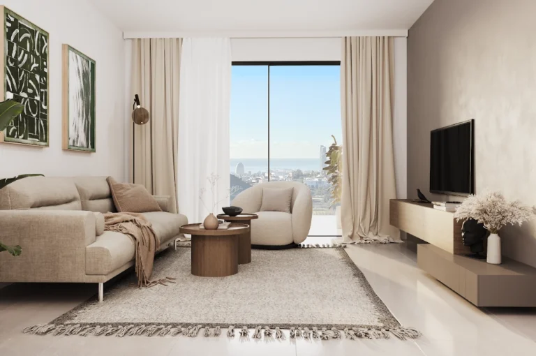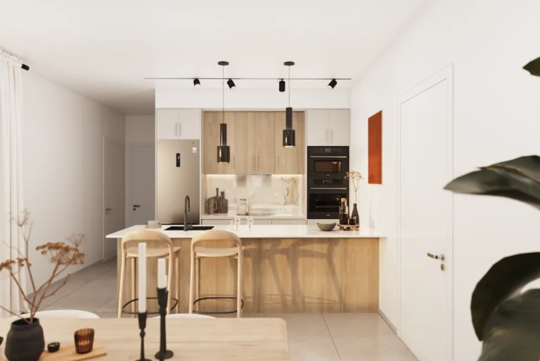 This modern apartment features a bright and spacious open-plan living and dining area, a stylish kitchen with high-quality finishes, and a comfortable bedroom designed for relaxation. Large windows allow plenty of natural light, creating a warm and welcoming atmosphere.