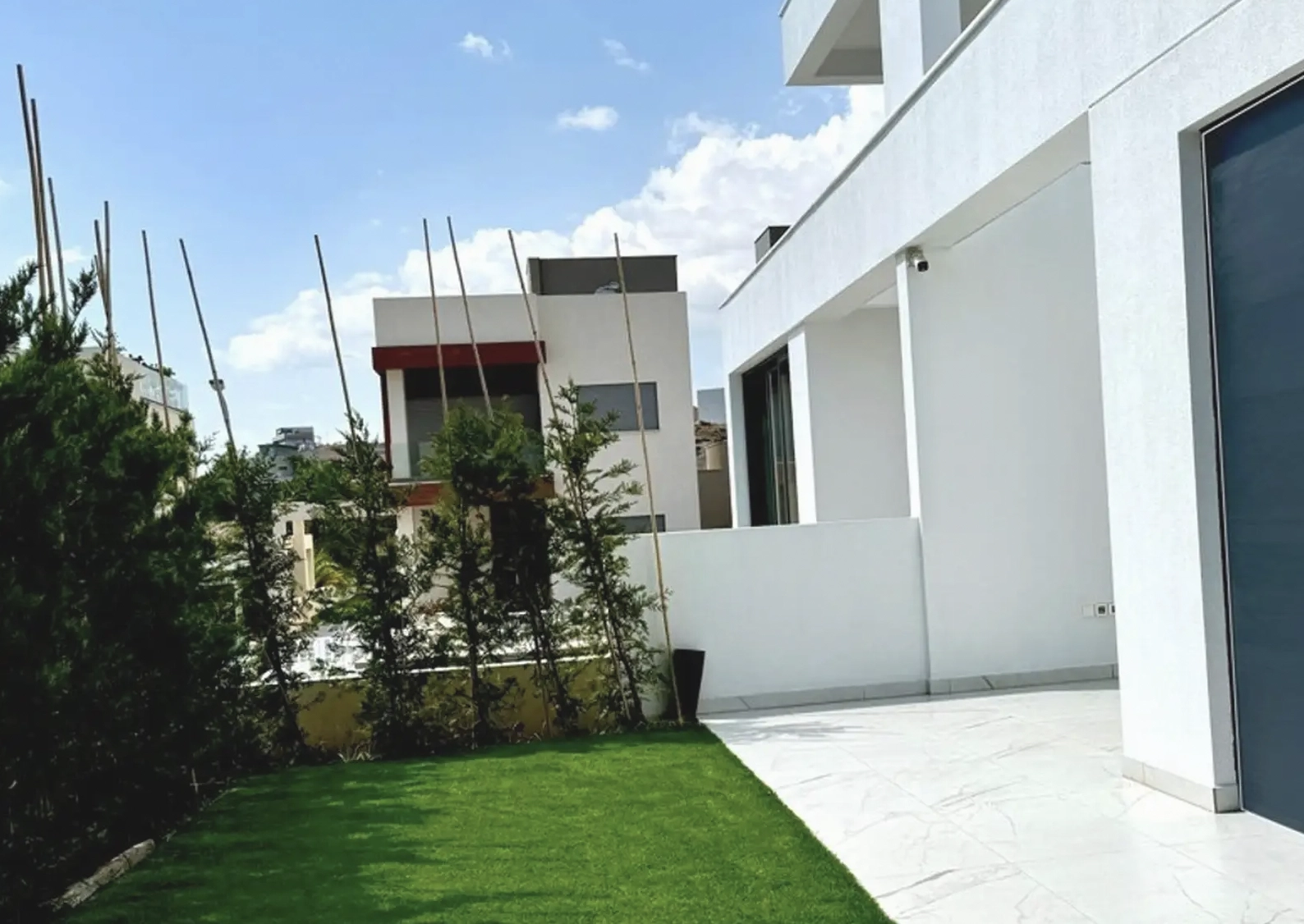 The villa features an open-plan living area with floor-to-ceiling windows, a premium Italian kitchen, one bedroom on the ground floor, and three bedrooms upstairs, including a master en-suite. Outside, there is a private BBQ garden with artificial grass and landscaped trees.