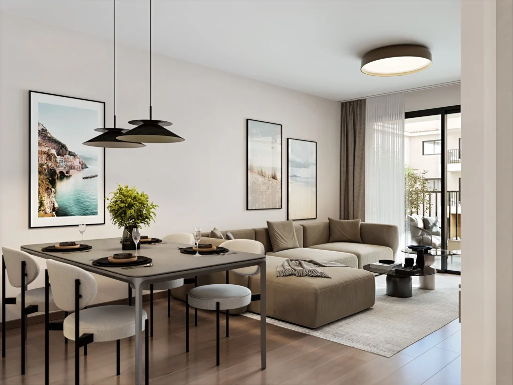 The apartment features a bright open-plan living and dining area with a modern kitchen, designed to maximise space and natural light. Large windows enhance the airy feel of the interiors, while the thoughtful layout provides both functionality and everyday comfort. Residents benefit from a peaceful setting next to a large green park, while remaining close to beaches, shops, cafés, and essential services.