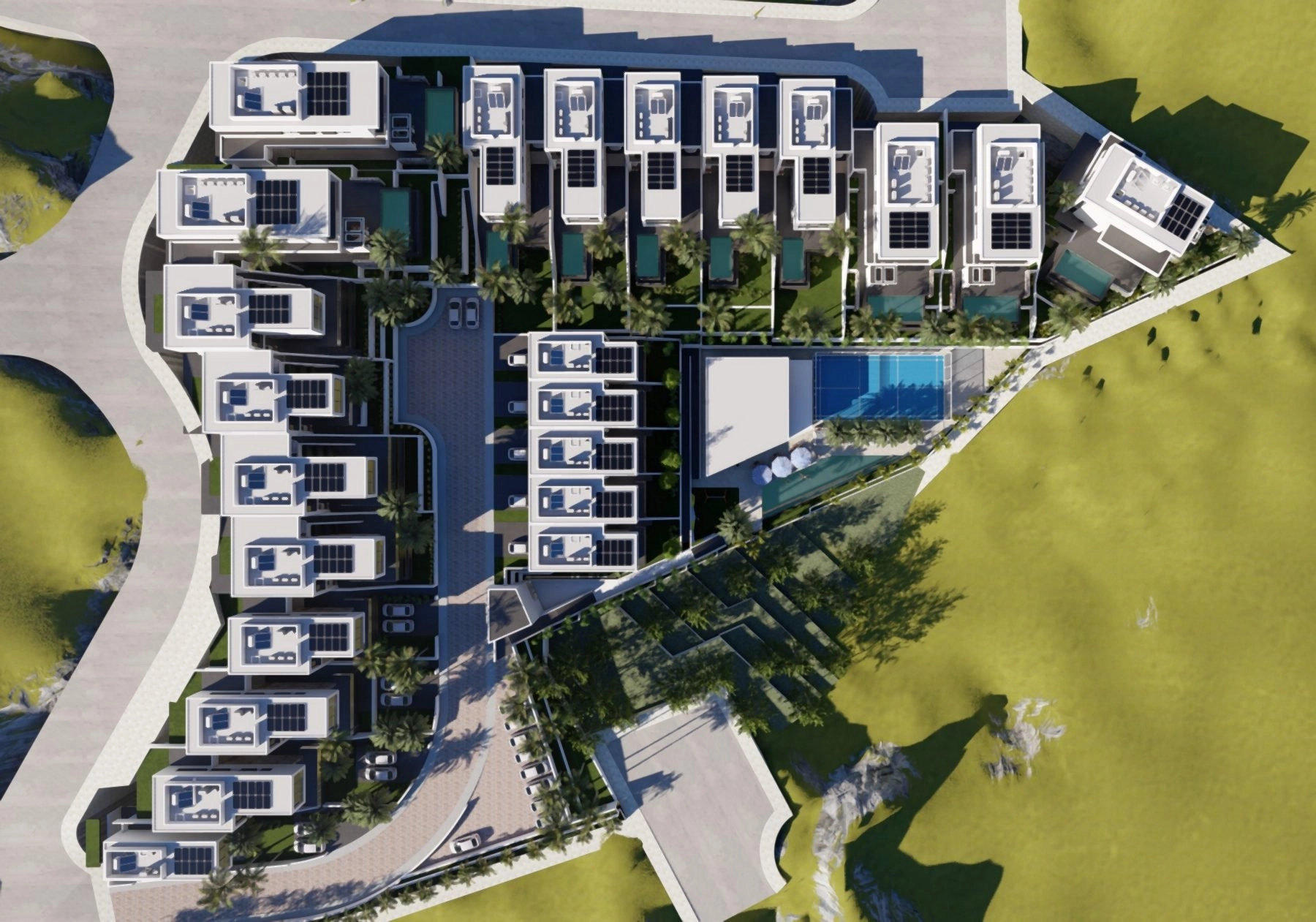 Beyond the private living spaces, the project unfolds as a complete lifestyle environment. A large communal swimming pool anchors the outdoor areas, surrounded by landscaped relaxation zones. Residents have access to a private clubhouse, co-working spaces for flexible workdays, a fully equipped gym and sauna, as well as an on-site padel court that brings energy and social interaction into daily life. Guest parking and 24-hour security provide convenience and peace of mind.