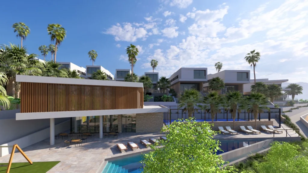 Beyond the private living spaces, the project unfolds as a complete lifestyle environment. A large communal swimming pool anchors the outdoor areas, surrounded by landscaped relaxation zones. Residents have access to a private clubhouse, co-working spaces for flexible workdays, a fully equipped gym and sauna, as well as an on-site padel court that brings energy and social interaction into daily life. Guest parking and 24-hour security provide convenience and peace of mind.