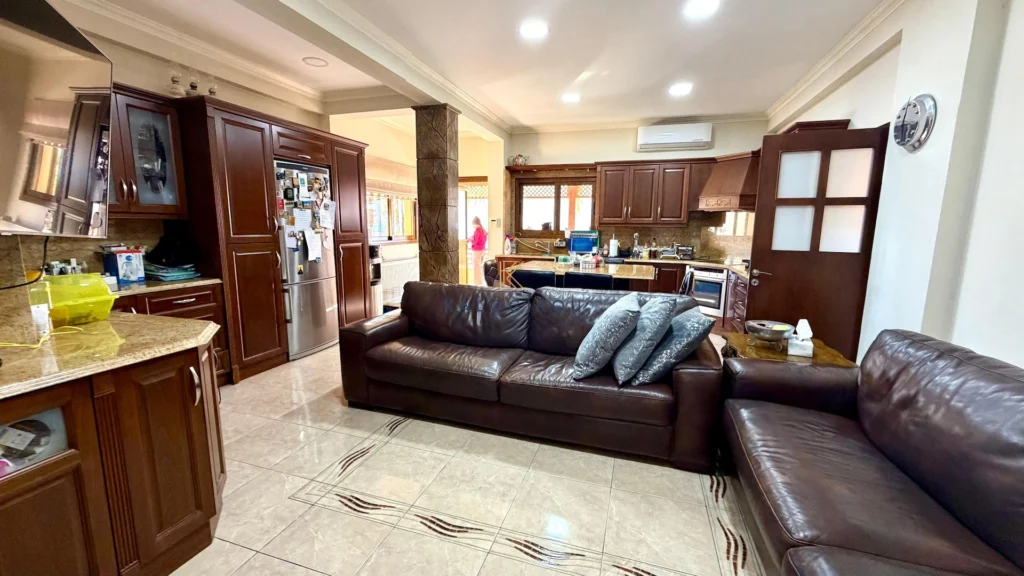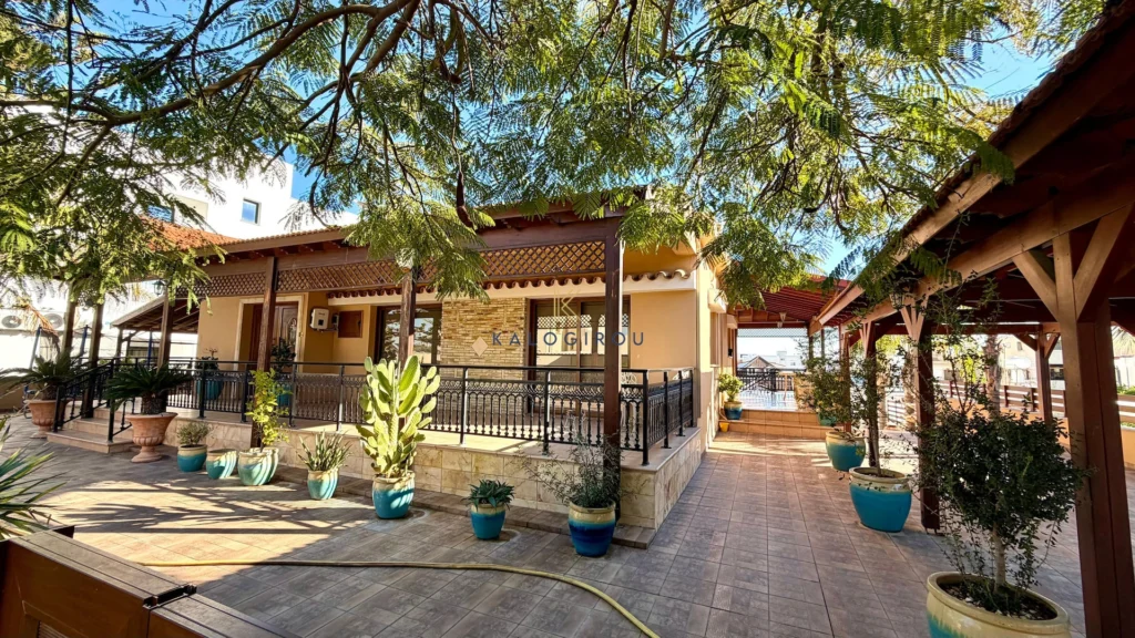 House for sale in Krasas area, Larnaca Town, set on a large 679sqm plot. The main residence offers approximately 152sqm of covered internal area in a bungalow-style layout. It consists of a living and dining area, separate kitchen, three bedrooms, two of which are en-suite, and a total of three bathrooms.