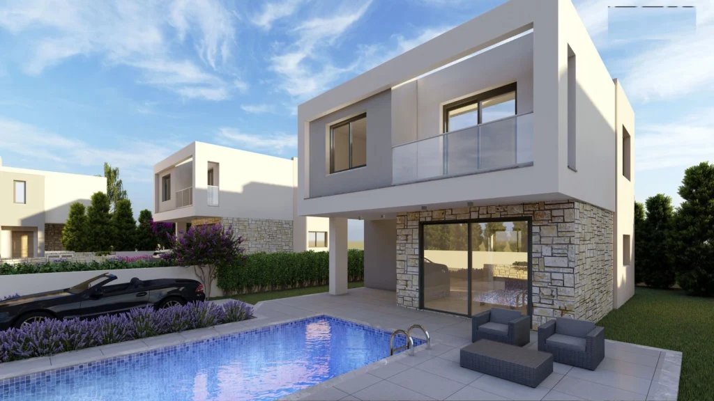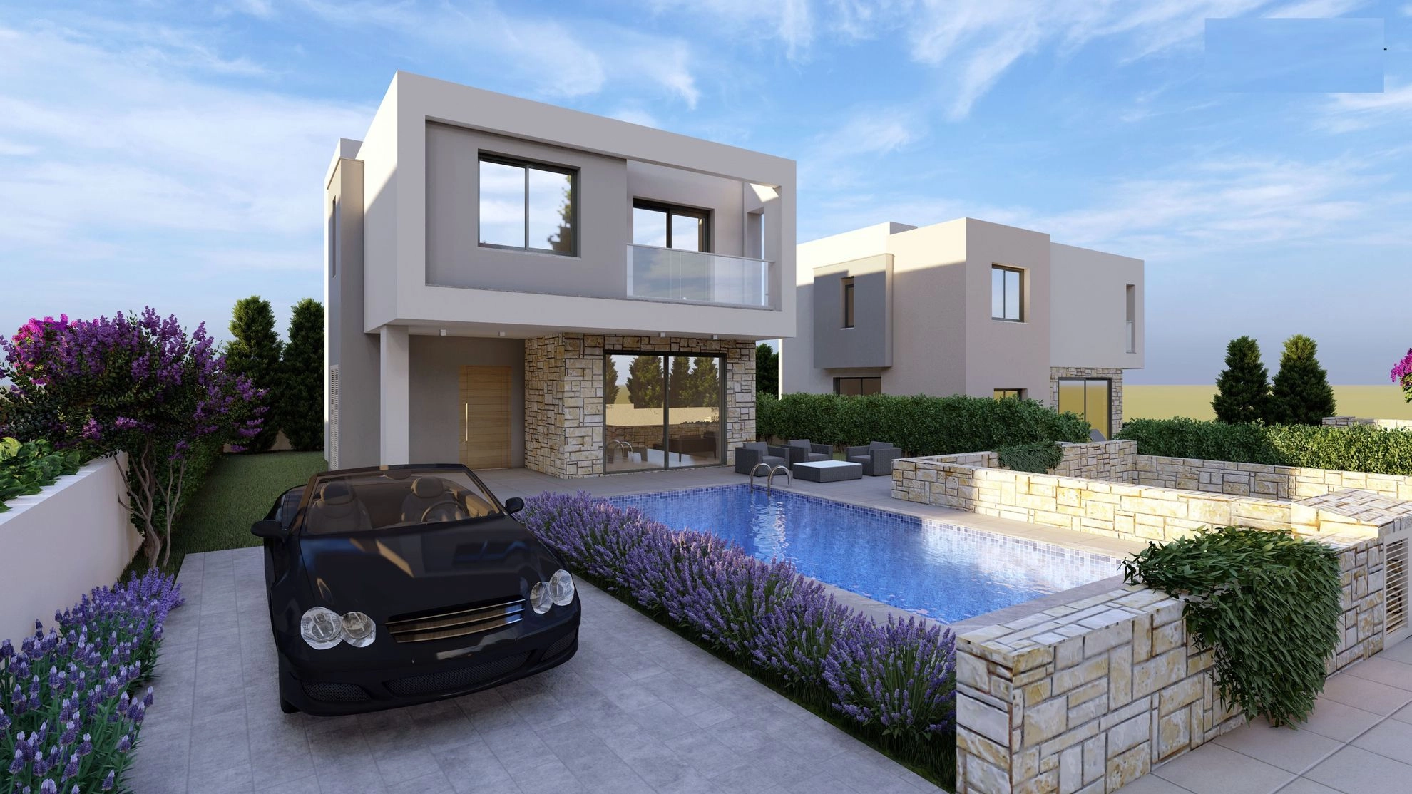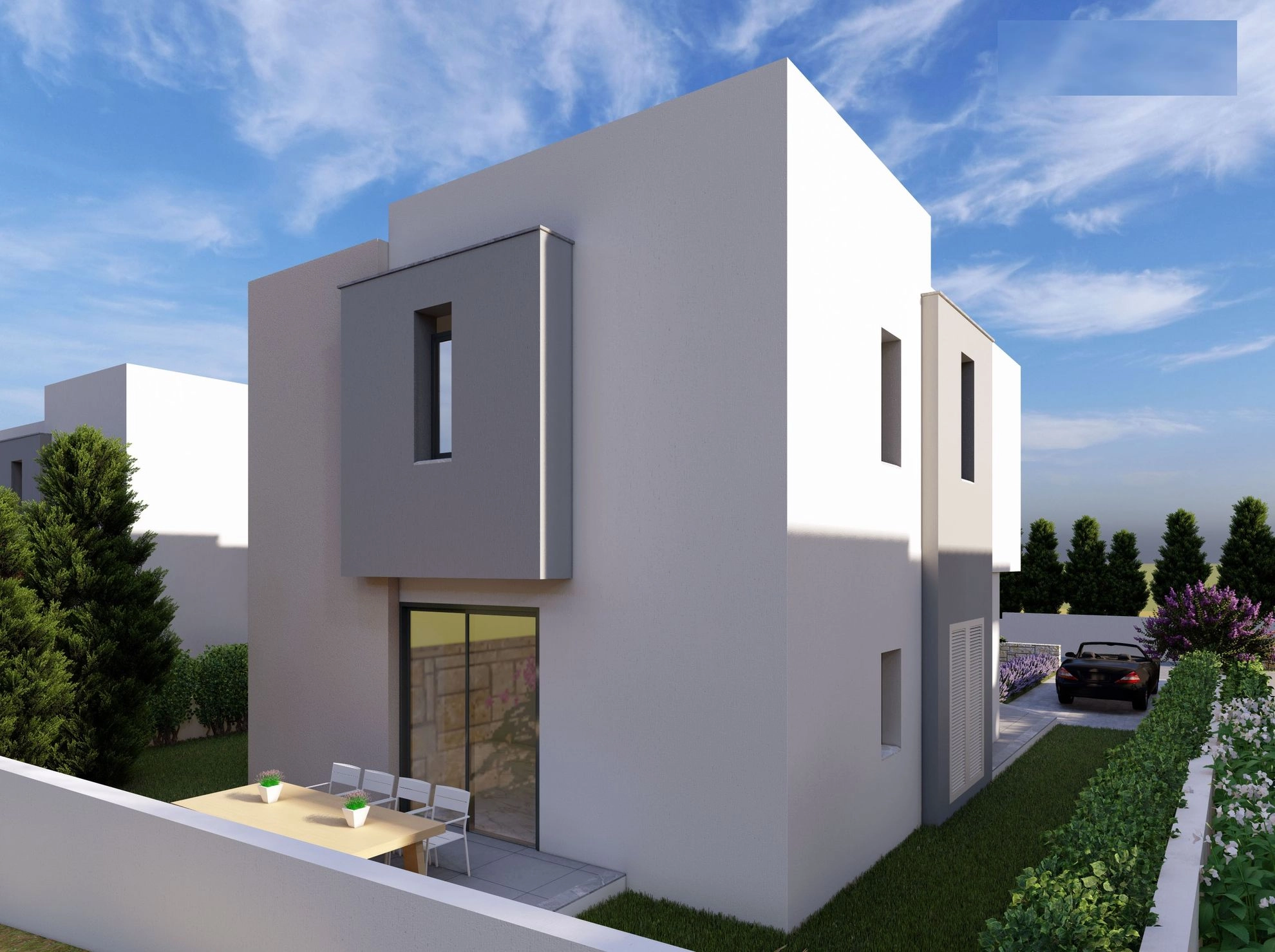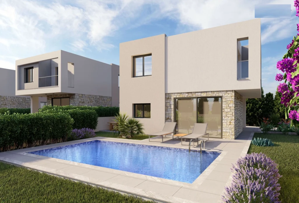 The complex is located 700m from the Chloraka sea in a peaceful and green suburban environment yet within range of 5 min drive to the mall and harbor and 10 min drive to the city center. The project consists of 4 modern design villas with open-plan layouts with 3 bedrooms, 2.5 bathrooms and a swimming pool. The villas will have a spacious living room, a U-shaped kitchen with quartz counters with the dining area right next to it. These areas will have big windows that bring in lots of light and offer outside views. The master bedroom will have its own en-suite bathroom with another communal bathroom that serves the rest of the bedrooms. The villas feature high quality specifications and finishes such as exterior natural stone cladding, marble staircase, quartz kitchen counters, aluminium and glass railings and much more. Roof garden terrace, under floor heating and photovoltaics are all available as extras. The Project has EPC certificate with “B” Energy Efficiency Rating.