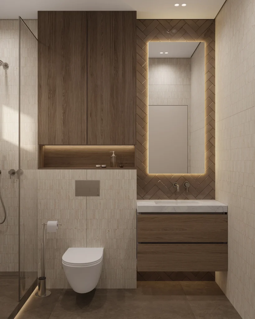 • Neutral tones, light wood, stone, and soft fabrics
