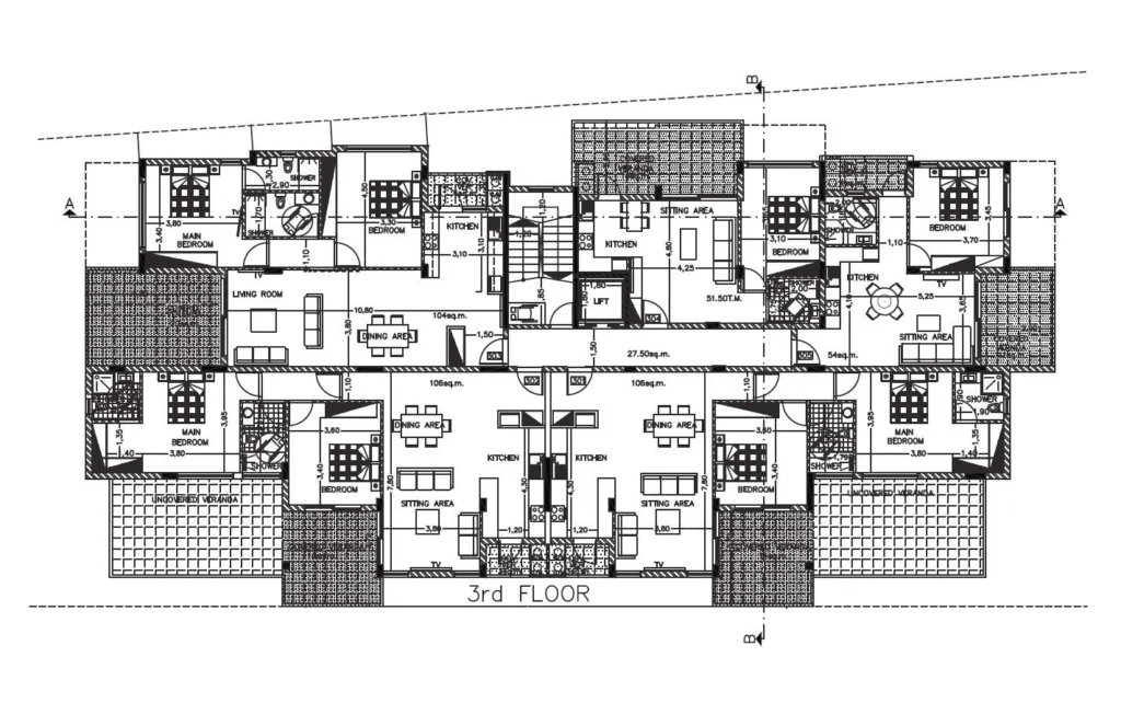 The development consists of a four-storey building including one-, two-, and three-bedroom apartments, as well as three-bedroom penthouses featuring expansive internal areas and wide, well-balanced layouts. The project comprises six one-bedroom apartments, nine two-bedroom apartments, and three three-bedroom residences in total, offering a well-balanced unit mix.
