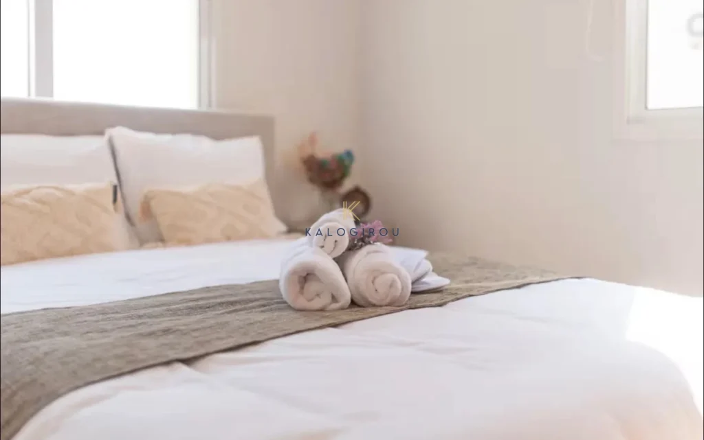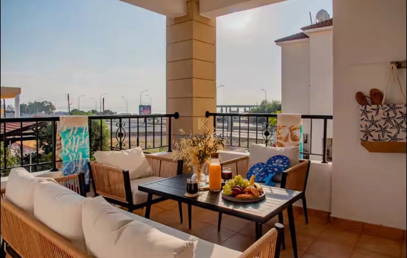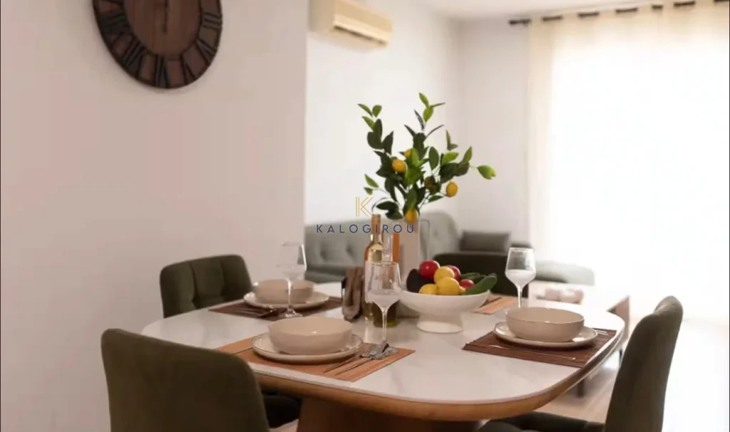 Apartment for sale in Oroklini, Larnaca. The property is fully furnished and consists of an open plan kitchen, living and dining area, two bedrooms, and one main bathroom.