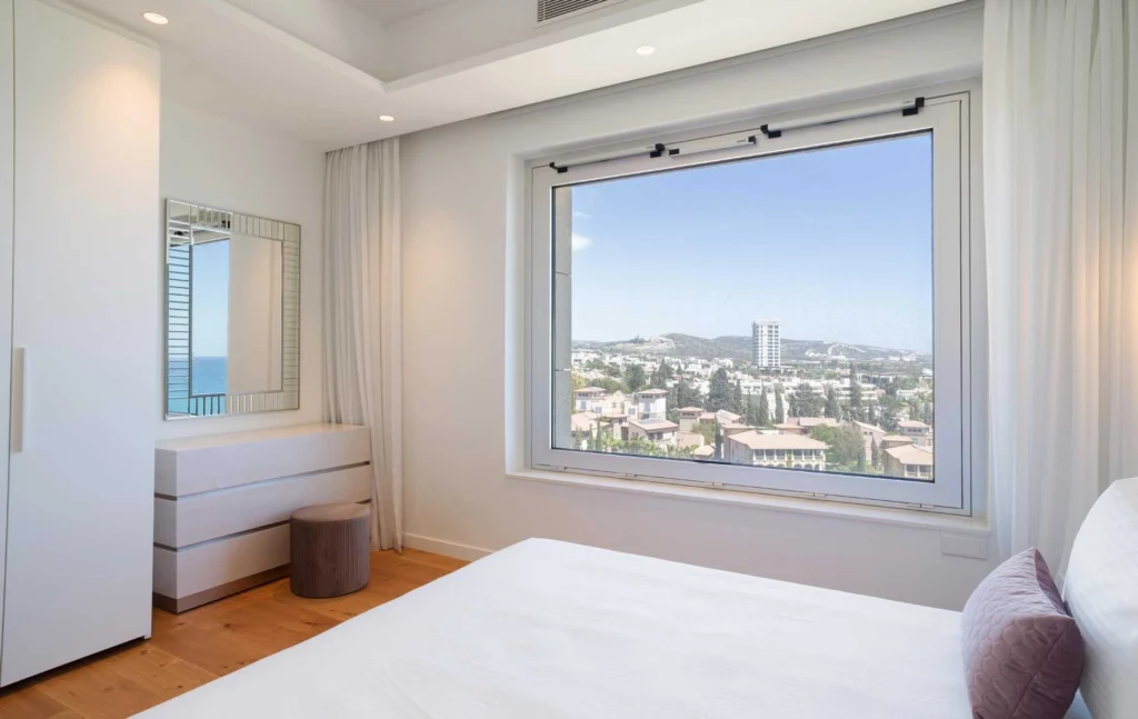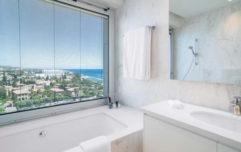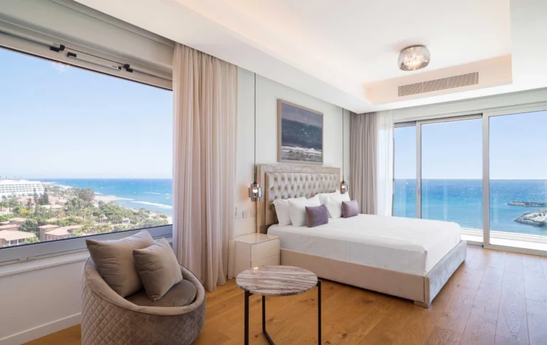 Two luxurious two-bedroom apartments occupying an entire floor are offered for sale, featuring stunning panoramic views of Limassol Bay, St Raphael Marina, and the resort gardens.