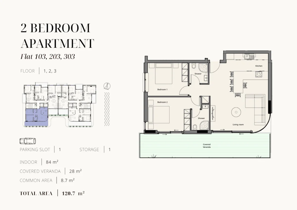 The master bedroom features an en-suite bathroom, while the second bedroom is served by a separate modern bathroom, providing flexibility and comfort for couples, families, or guests. Thoughtful planning ensures that every square metre is used efficiently, enhancing everyday living.