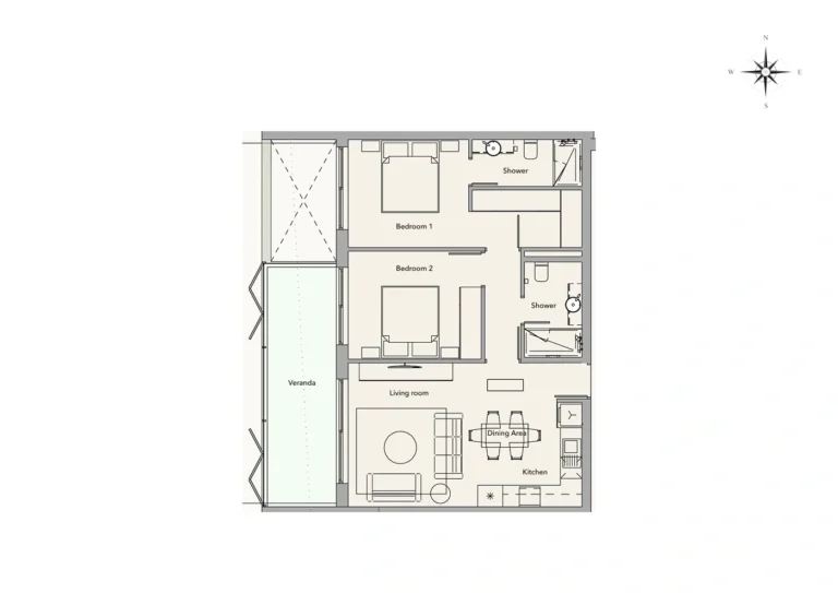 This two-bedroom, two-bathroom apartment is set within a peaceful, nature-driven community of 56 residences across four boutique buildings. The open-plan living area flows onto a generous covered veranda, maximising light and seamless indoor–outdoor living.