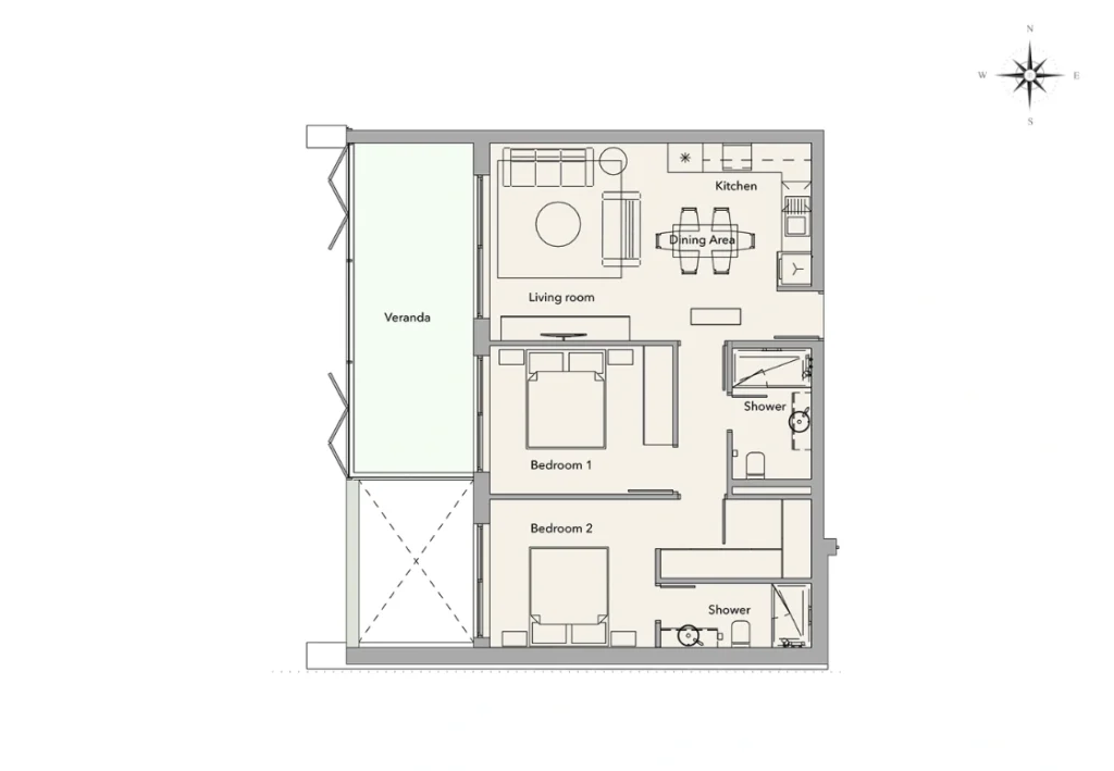 This two-bedroom, two-bathroom apartment is set within a peaceful, nature-driven community of 56 residences across four boutique buildings. The open-plan living area flows onto a generous covered veranda, maximising light and seamless indoor–outdoor living.