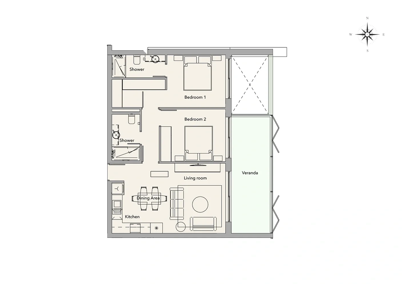 This two-bedroom, two-bathroom apartment is set within a peaceful, nature-driven community of 56 residences across four boutique buildings. The open-plan living area flows onto a generous covered veranda, maximising light and seamless indoor–outdoor living.