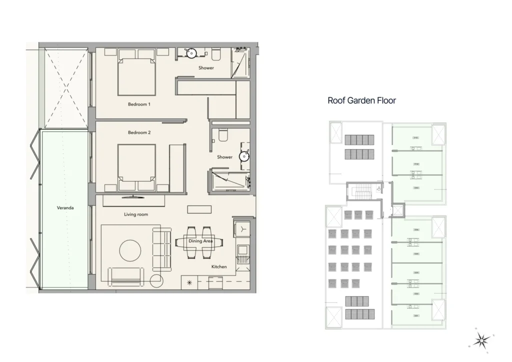 This two-bedroom, two-bathroom apartment is set within a peaceful, nature-driven community of 56 residences across four boutique buildings. The open-plan living area flows onto a generous covered veranda, maximising light and seamless indoor–outdoor living. A private rooftop terrace further extends the living space, offering an ideal area for relaxation, entertaining, and enjoying panoramic views.