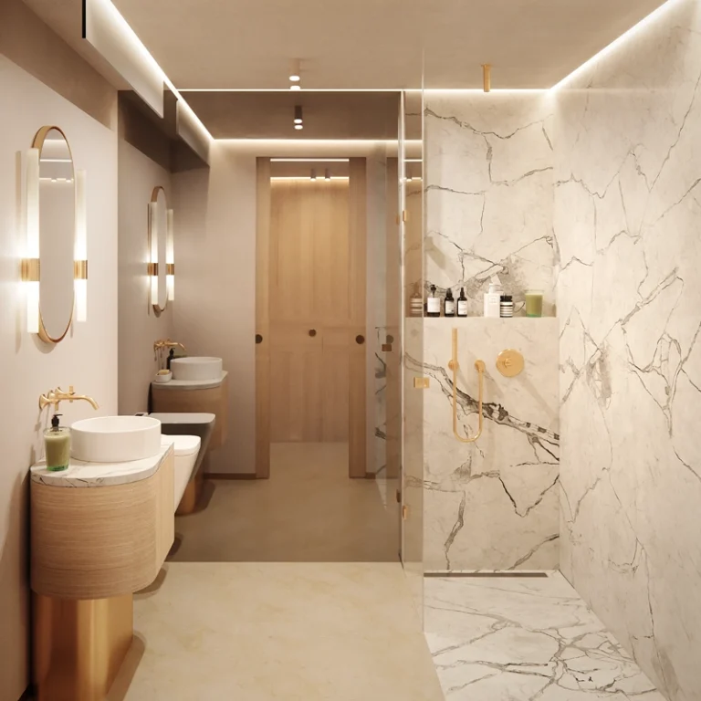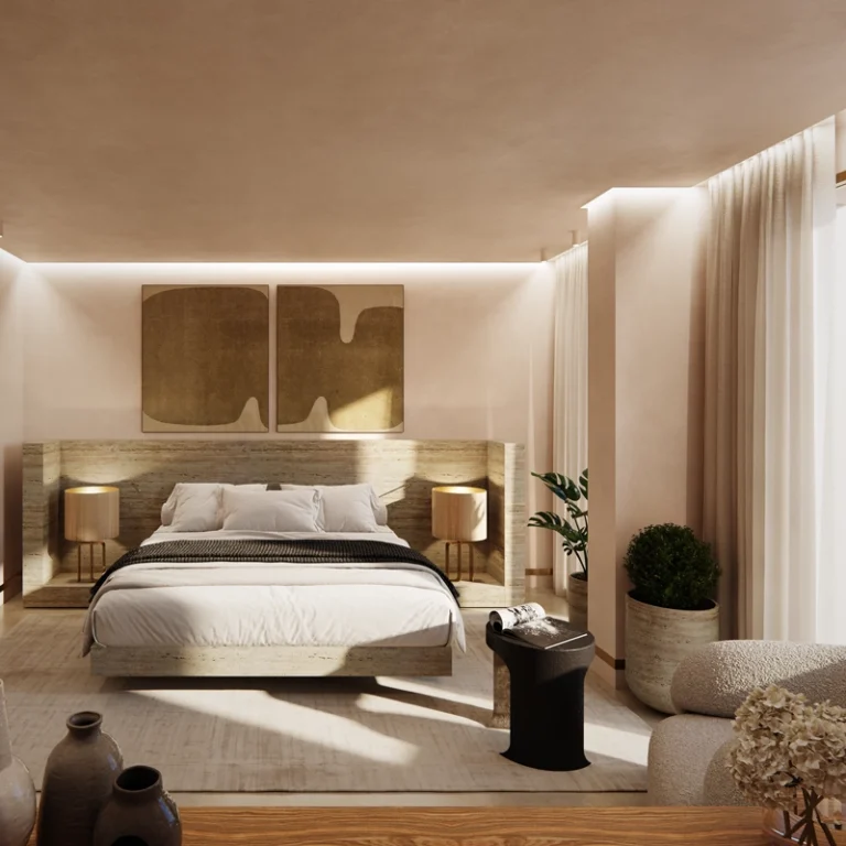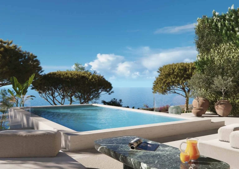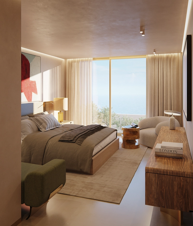 This four-bedroom duplex residence is inspired by the Art Deco elegance of the Riviera and designed by renowned Parisian aesthete Thierry Lemaire. Natural materials, muted tones, and refined copper and gold accents echo the surrounding coastal landscape, while floor-to-ceiling windows flood the interiors with Mediterranean light.