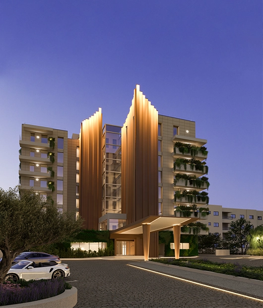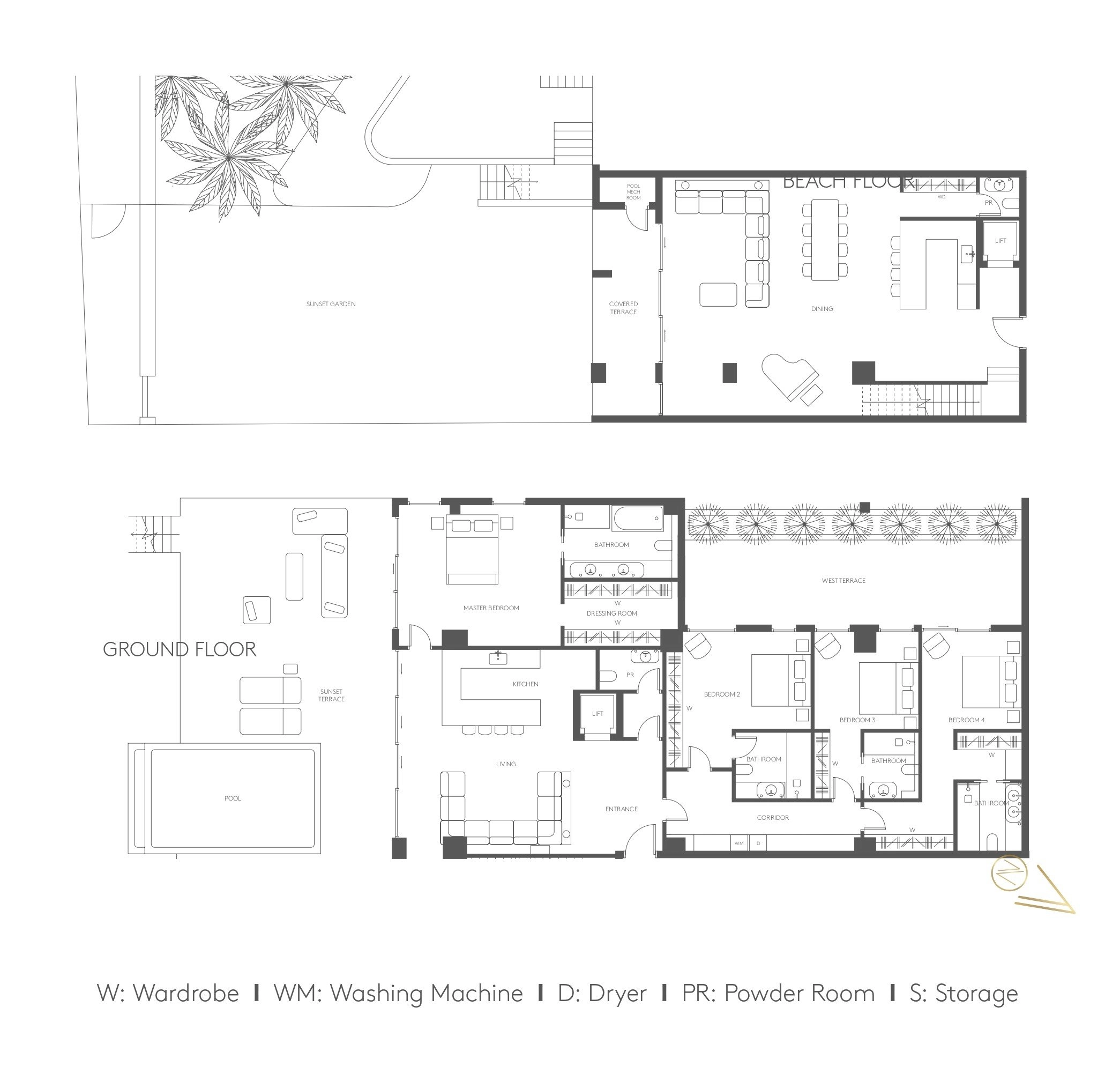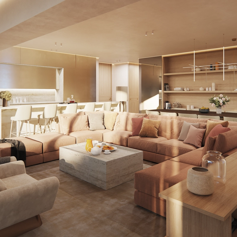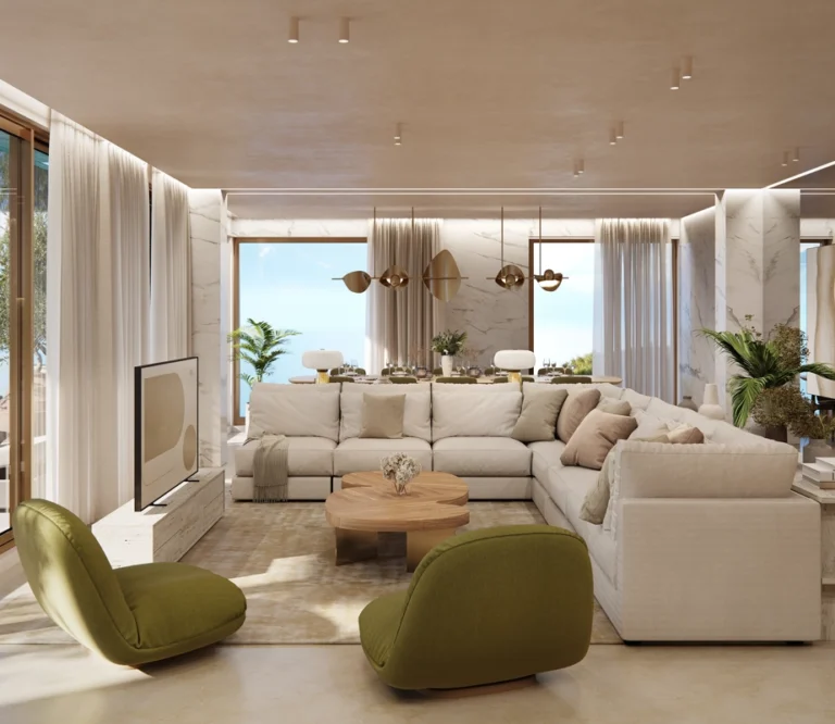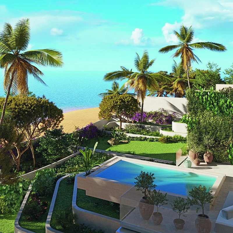 Expansive open-plan living areas flow seamlessly onto a south-facing terrace with an infinity pool, continuing down to a private landscaped garden with direct access to the sandy beach. A west-facing terrace offers beautiful city views and sunset moments, creating exceptional indoor–outdoor living and entertaining spaces.