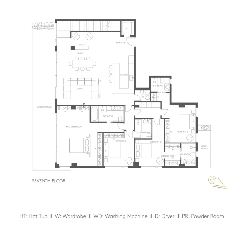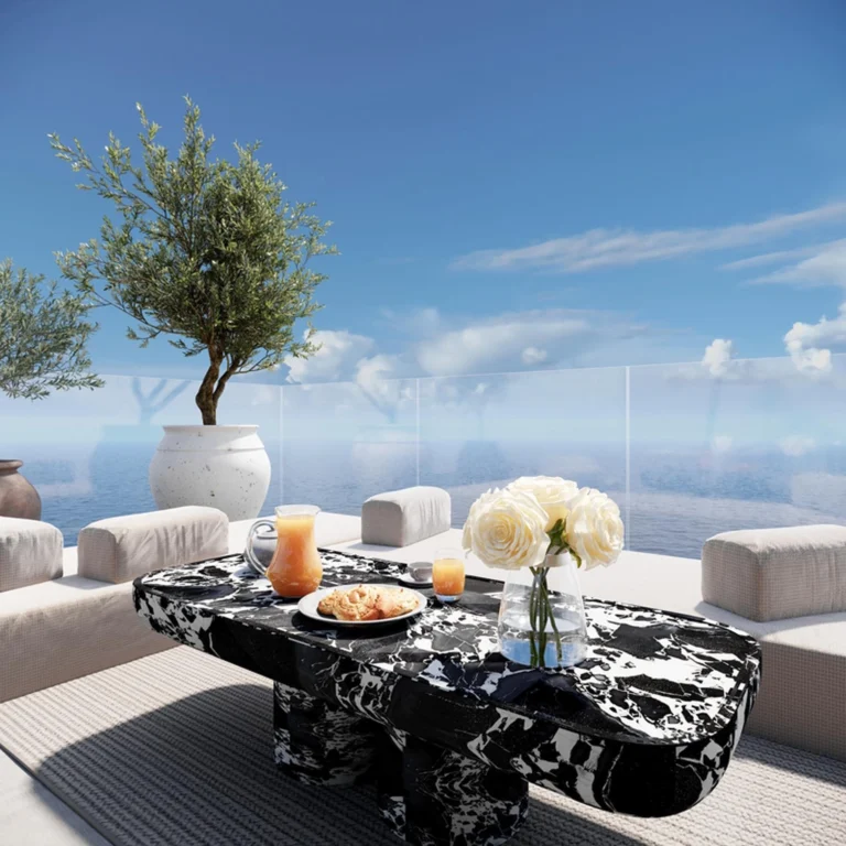 Set on the highest floors, the penthouse offers breathtaking views over Limassol, the beach, and the Mediterranean Sea. Multiple terraces and a private rooftop garden provide space for sunbathing, alfresco dining, or entertaining at the signature marble-topped bar. An infinity pool completes the rooftop oasis.